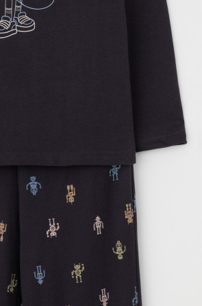 Трикотажная пижама из натурального хлопка. Джемпер с длинными рукавами с принтом. У брюк эластичный пояс на резинке. Оригинальные принт и набивка выполнены из стойких, гипоаллергенных текстильных красителей. Пижама сохраняет цвет и форму после многократных стирок. Все трикотажные полотна производятся в соответсвии с нормами Швейцарского сертификата ЭкоТекс.