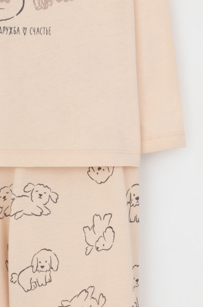 Трикотажная пижама из натурального хлопка. Джемпер с длинными втачными рукавами и брюки с эластичной резинкой в поясе. Мягкие манжеты по низу брюк. Оригинальные набивка и принт выполнены из стойких гипоаллергенных текстильных гипоаллергенных красителей. Изделие сохраняет цвет и форму после многократных стирок. Все трикотажные полотна производятся в соответсвии с нормами швейцарского сертификата ЭкоТекс.