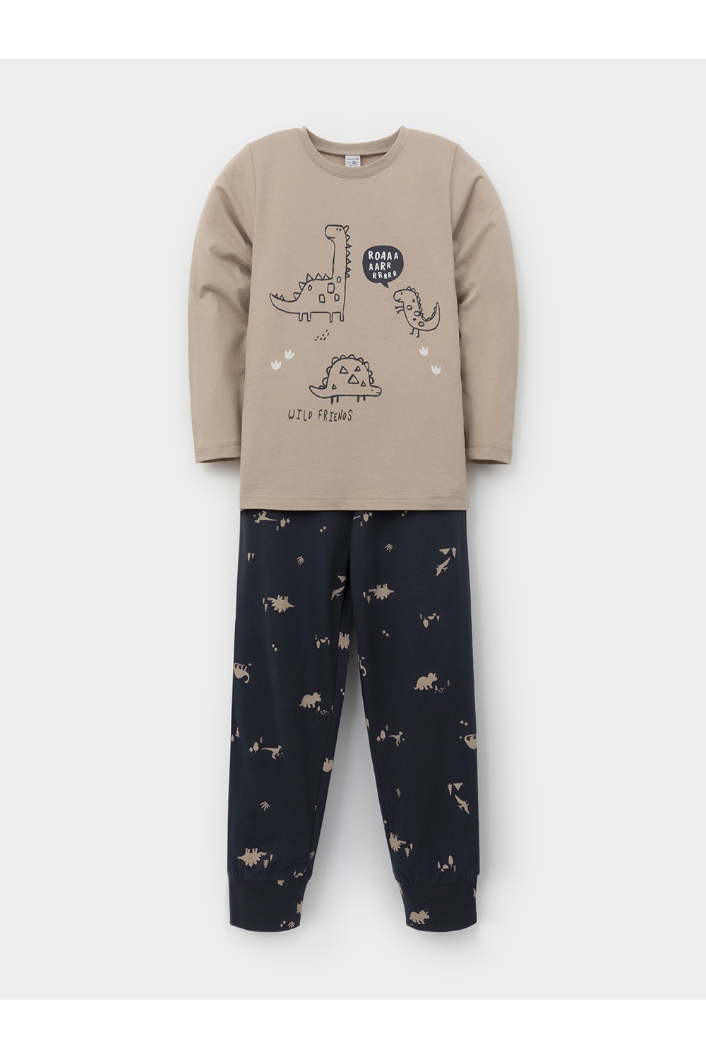 Пижама для мальчика из натурального хлопка. Джемпер с длинными втачными рукавами и брюки с эластичной резинкой в поясе. Мягкие манжеты по низу брюк сделаны из материала в рубчик. Оригинальная набивка и принт выполнены из стойких текстильных гипоаллергенных красителей. Изделие сохраняет цвет и форму после многократных стирок. Все трикотажные полотна производятся в соответствии с нормами швейцарского сертификата ЭкоТекс.