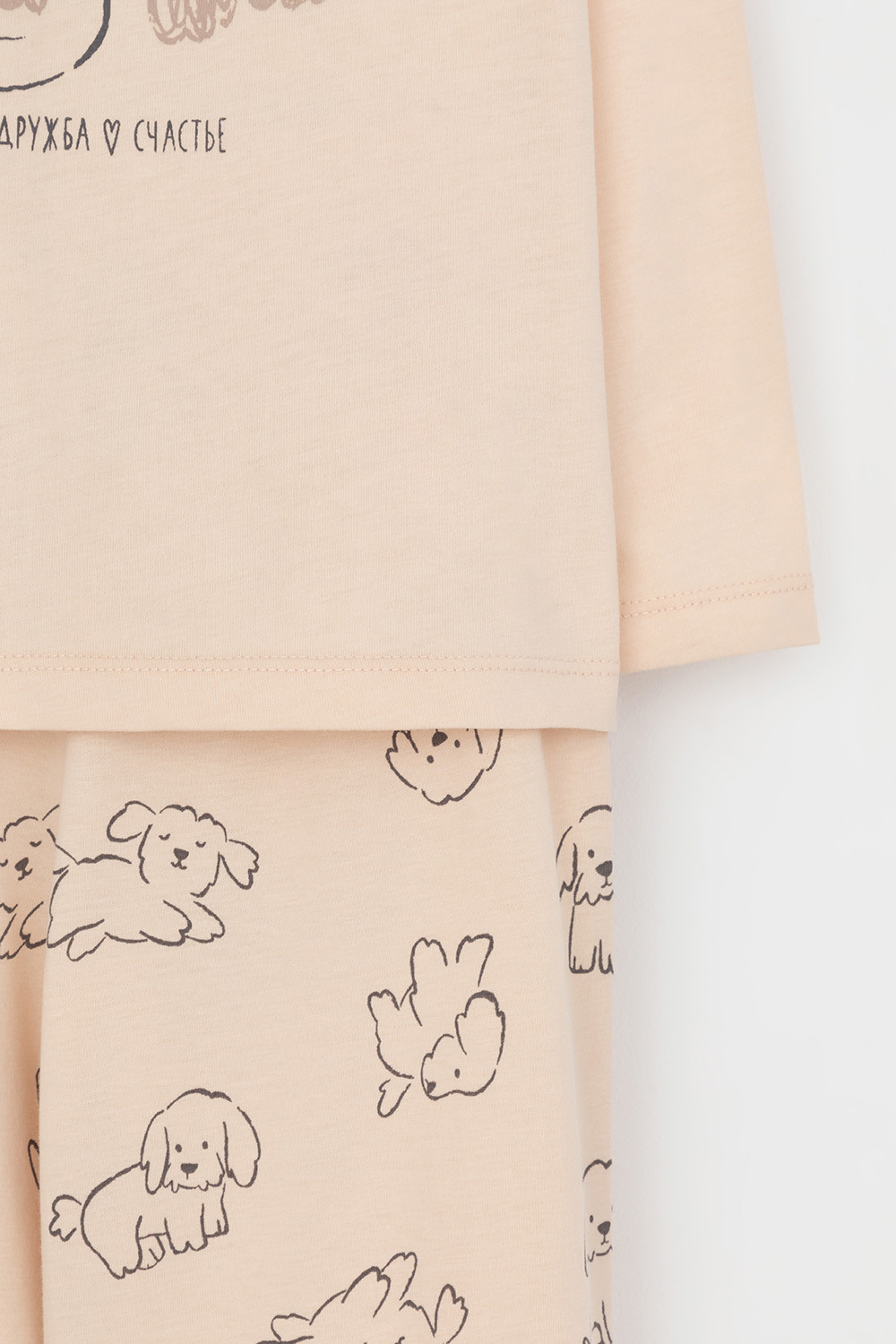 Трикотажная пижама из натурального хлопка. Джемпер с длинными втачными рукавами и брюки с эластичной резинкой в поясе. Мягкие манжеты по низу брюк. Оригинальные набивка и принт выполнены из стойких гипоаллергенных текстильных гипоаллергенных красителей. Изделие сохраняет цвет и форму после многократных стирок. Все трикотажные полотна производятся в соответсвии с нормами швейцарского сертификата ЭкоТекс.