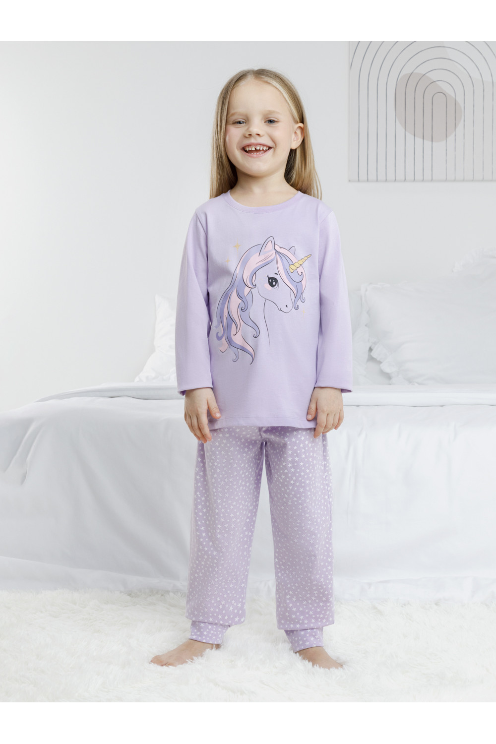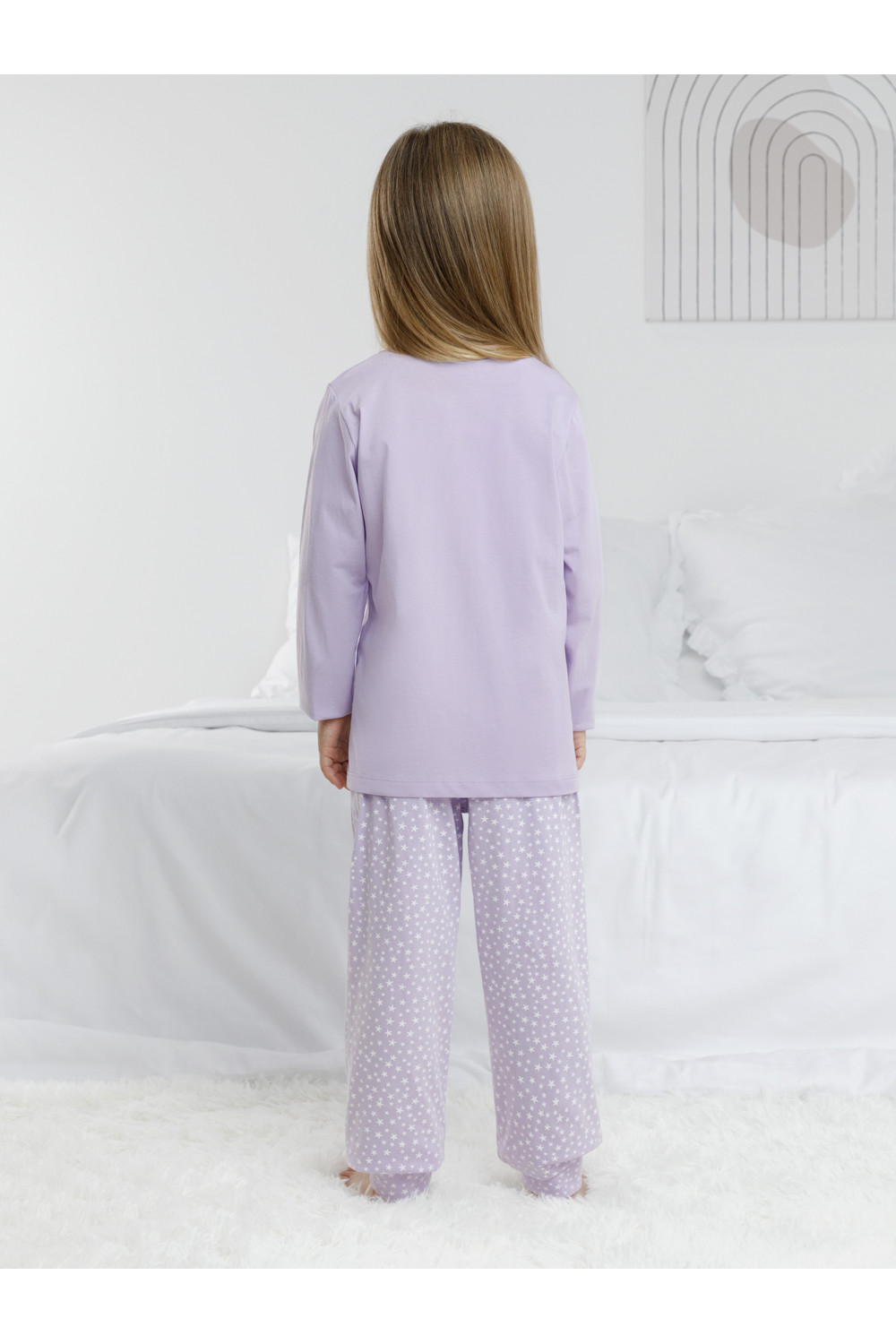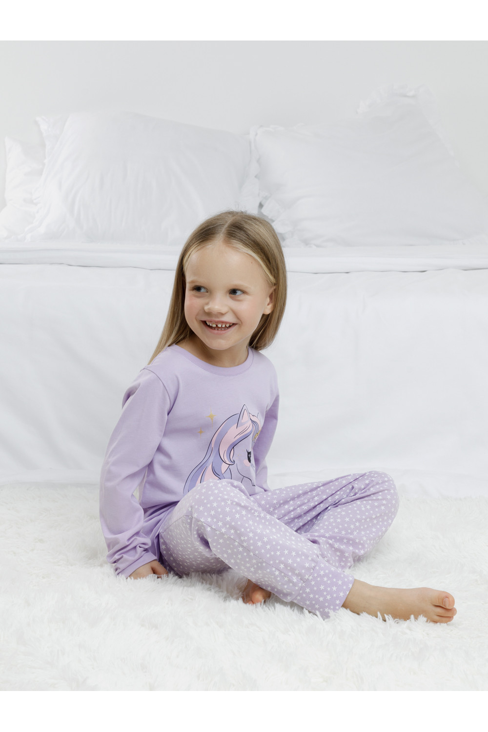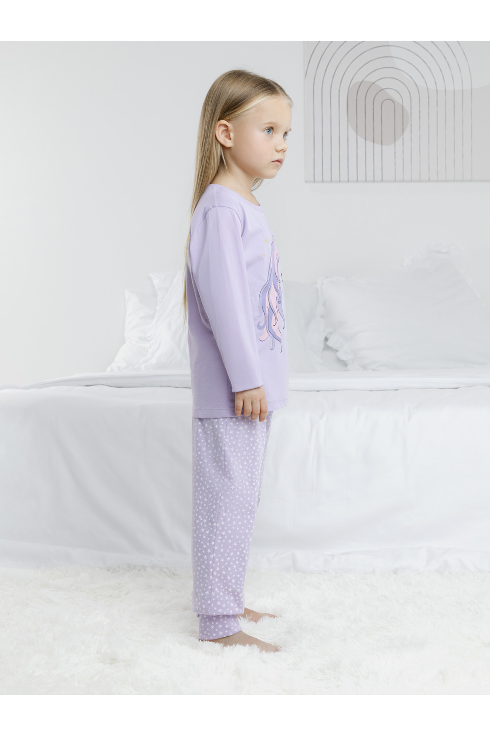Пижама для девочки из натурального хлопка. Джемпер с длинными втачными рукавами и брюки с эластичной резинкой в поясе. Мягкие манжеты по низу брюк сделаны из материала в рубчик. Оригинальная набивка и принт выполнены из стойких текстильных гипоаллергенных красителей. Изделие сохраняет цвет и форму после многократных стирок. Все трикотажные полотна производятся в соответствии с нормами швейцарского сертификата ЭкоТекс.