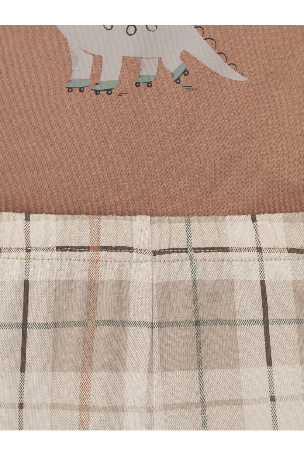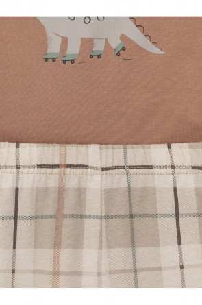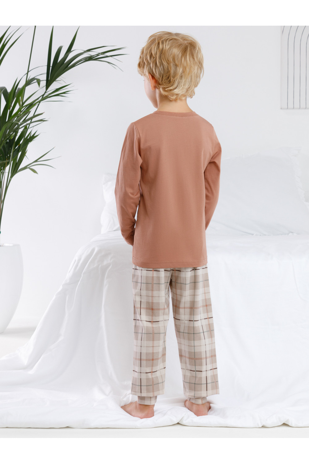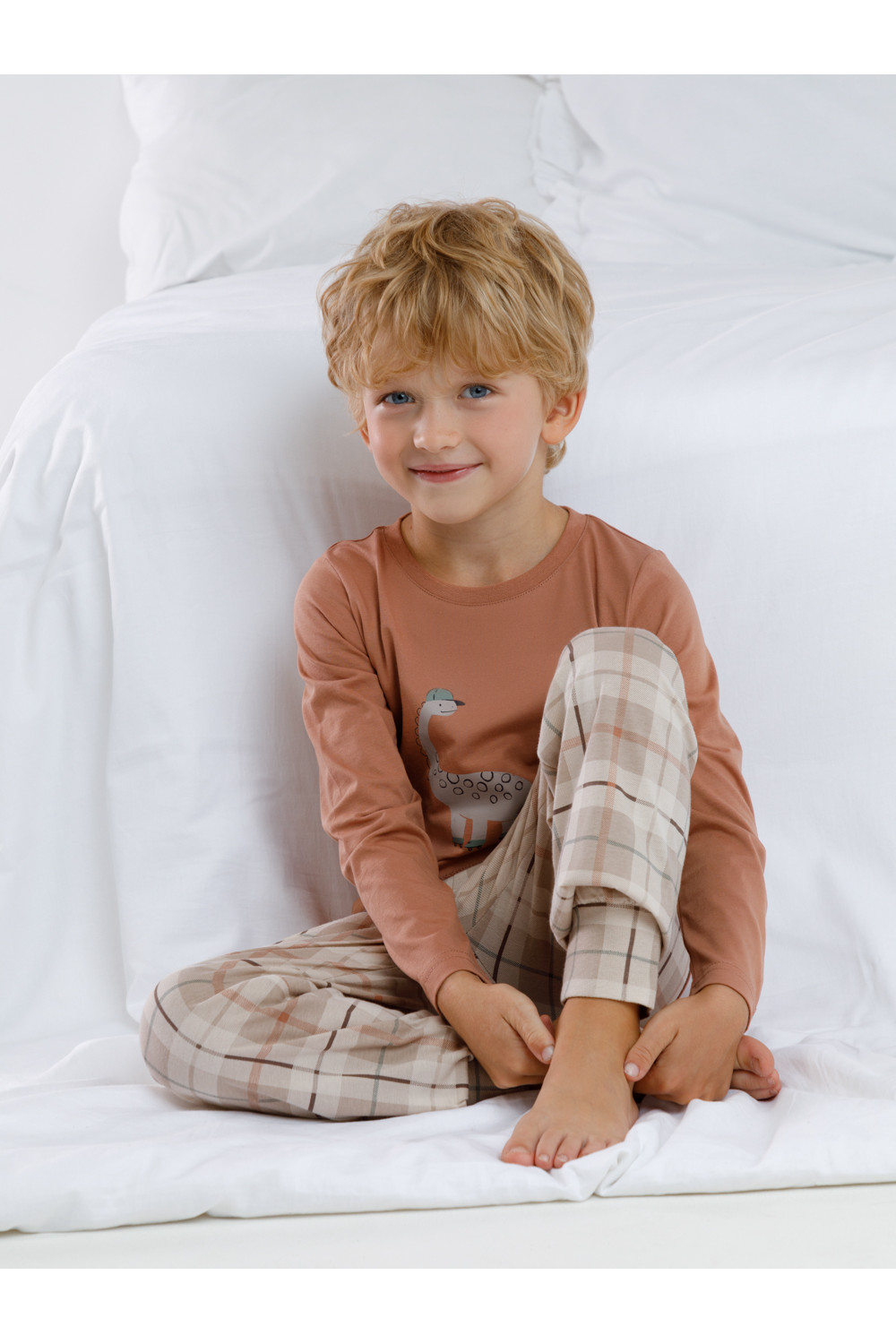Пижама для мальчика из натурального хлопка. Джемпер с длинными втачными рукавами и брюки с эластичной резинкой в поясе. Мягкие манжеты по низу брюк сделаны из материала в рубчик. Оригинальная набивка и принт выполнены из стойких текстильных гипоаллергенных красителей. Изделие сохраняет цвет и форму после многократных стирок. Все трикотажные полотна производятся в соответствии с нормами швейцарского сертификата ЭкоТекс.