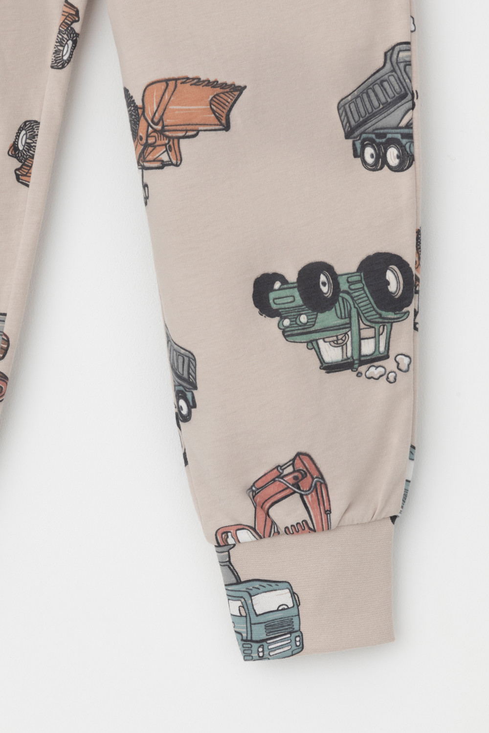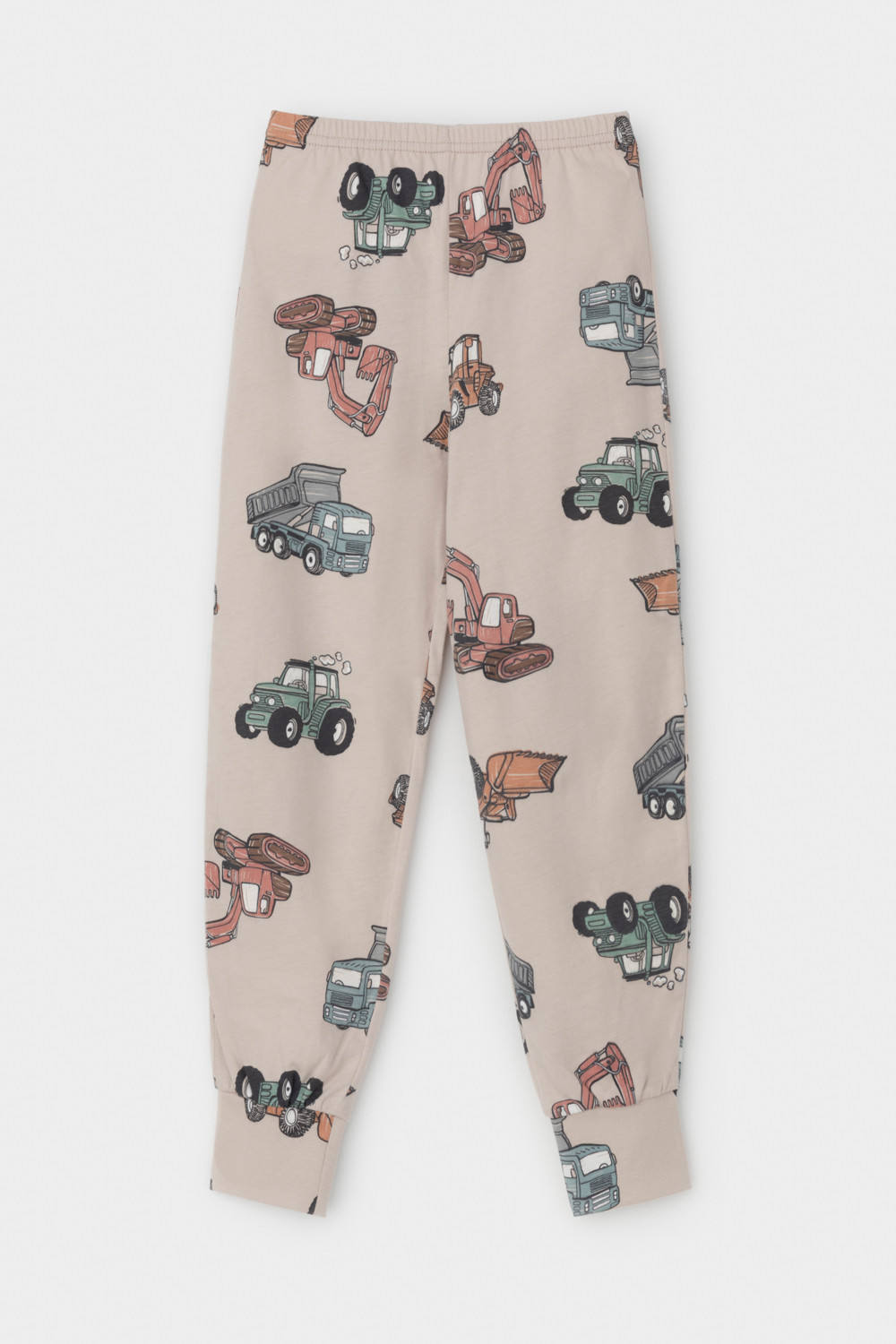 Пижама для мальчика из натурального хлопка. Джемпер с длинными втачными рукавами и брюки с эластичной резинкой в поясе. Мягкие манжеты по низу брюк сделаны из материала в рубчик. Оригинальная набивка и принт выполнены из стойких текстильных гипоаллергенных красителей. Изделие сохраняет цвет и форму после многократных стирок. Все трикотажные полотна производятся в соответствии с нормами швейцарского сертификата ЭкоТекс.