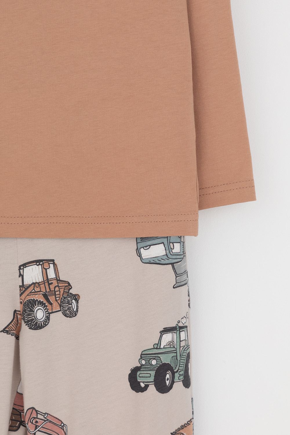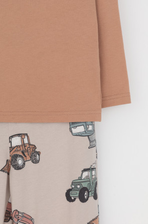 Пижама для мальчика из натурального хлопка. Джемпер с длинными втачными рукавами и брюки с эластичной резинкой в поясе. Мягкие манжеты по низу брюк сделаны из материала в рубчик. Оригинальная набивка и принт выполнены из стойких текстильных гипоаллергенных красителей. Изделие сохраняет цвет и форму после многократных стирок. Все трикотажные полотна производятся в соответствии с нормами швейцарского сертификата ЭкоТекс.
