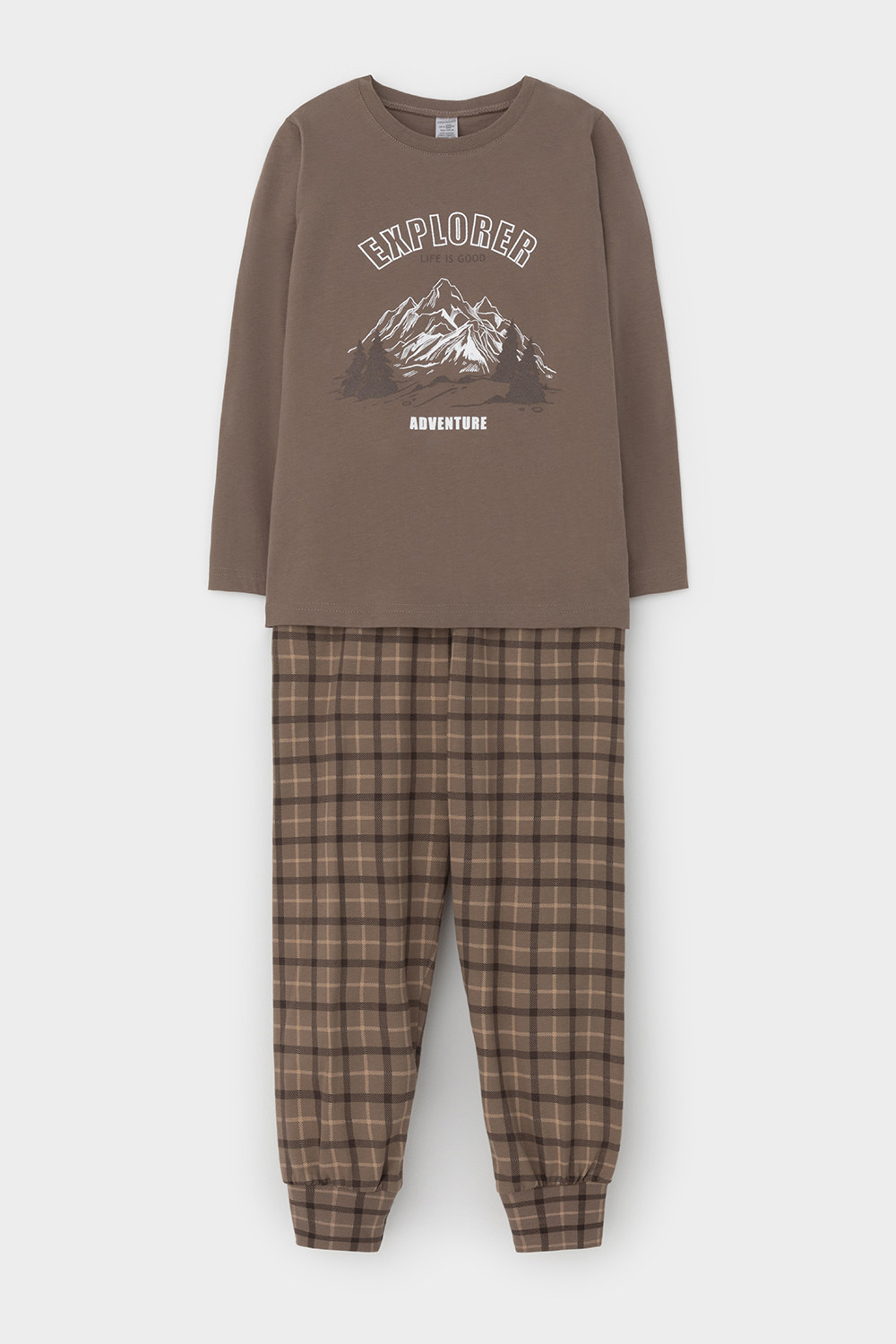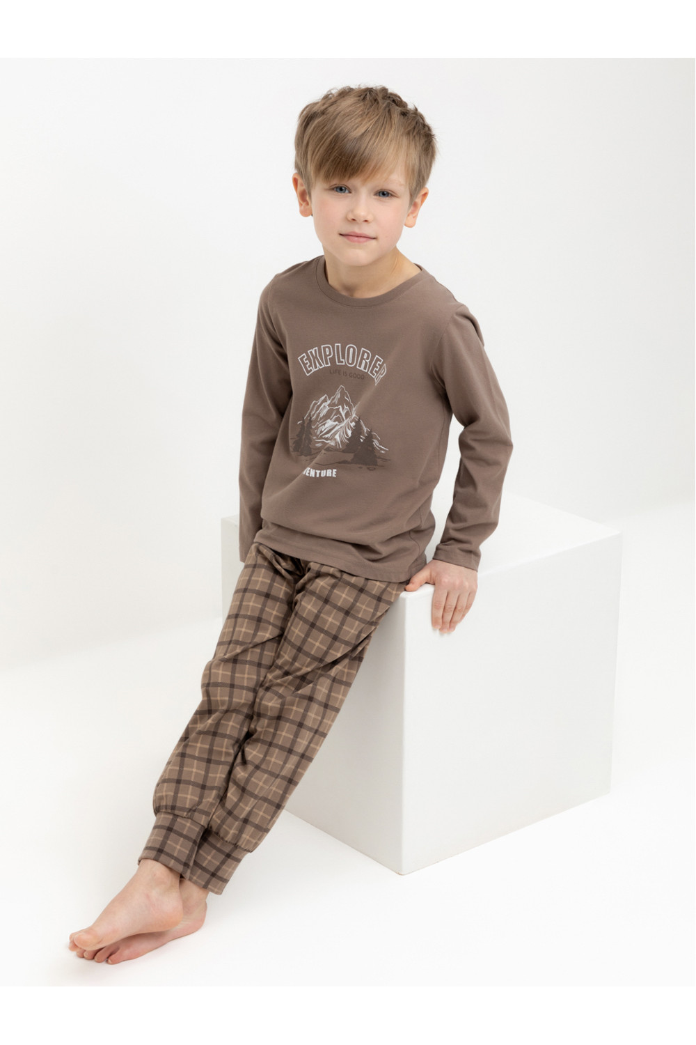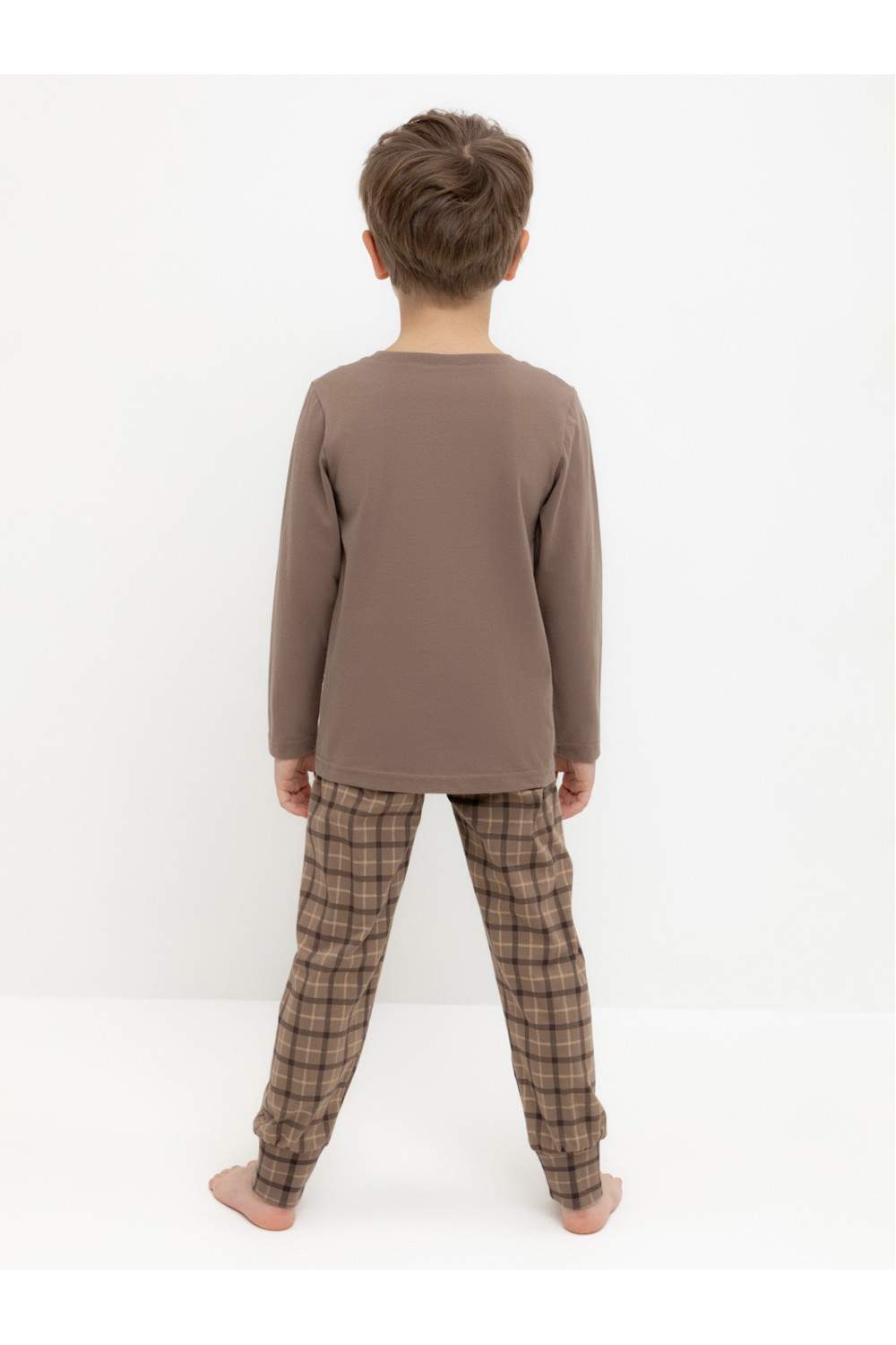 Пижама для мальчика из натурального хлопка. Джемпер с длинными втачными рукавами и брюки с эластичной резинкой в поясе. Мягкие манжеты по низу брюк сделаны из материала в рубчик. Оригинальная набивка и принт выполнены из стойких текстильных гипоаллергенных красителей. Изделие сохраняет цвет и форму после многократных стирок. Все трикотажные полотна производятся в соответствии с нормами швейцарского сертификата ЭкоТекс.