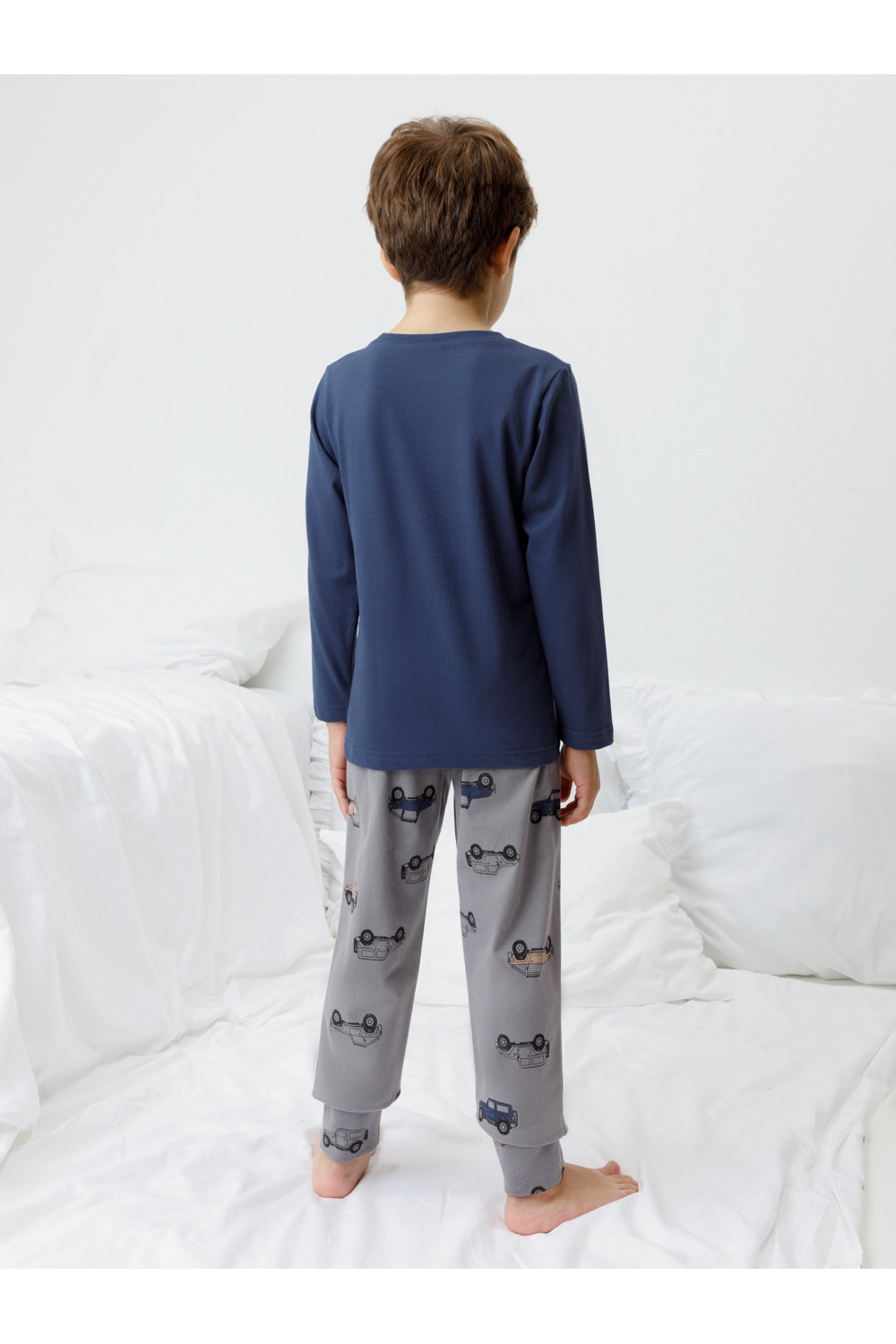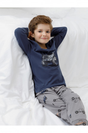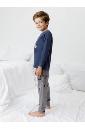 Пижама для мальчика из натурального хлопка. Джемпер с длинными втачными рукавами и брюки с эластичной резинкой в поясе. Мягкие манжеты по низу брюк сделаны из материала в рубчик. Оригинальная набивка и принт выполнены из стойких текстильных гипоаллергенных красителей. Изделие сохраняет цвет и форму после многократных стирок. Все трикотажные полотна производятся в соответствии с нормами швейцарского сертификата ЭкоТекс.