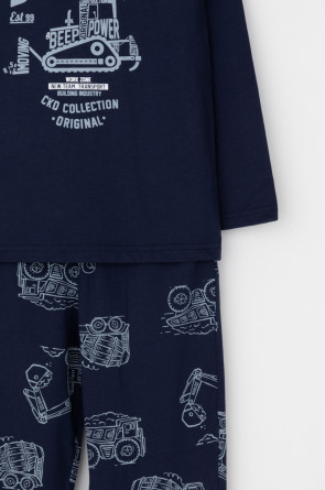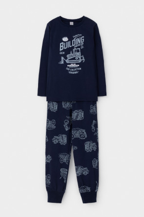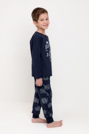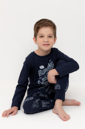 Пижама для мальчика из натурального хлопка. Джемпер с длинными втачными рукавами и брюки с эластичной резинкой в поясе. Мягкие манжеты по низу брюк сделаны из материала в рубчик. Оригинальная набивка и принт выполнены из стойких текстильных гипоаллергенных красителей. Изделие сохраняет цвет и форму после многократных стирок. Все трикотажные полотна производятся в соответствии с нормами швейцарского сертификата ЭкоТекс.