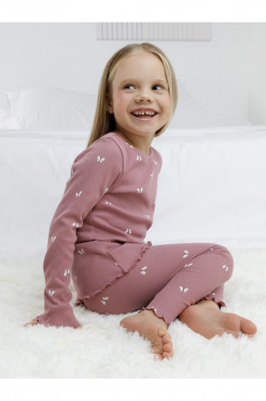 Трикотажная пижама в рубчик из натурального хлопка. Джемпер с длинными втачными рукавами и лосины с эластичной резинкой в поясе. Оригинальная набивка выполнена из стойких текстильных гипоаллергенных красителей. Изделие сохраняет цвет и форму после многократных стирок. Все трикотажные полотна производятся в соответствии с нормами швейцарского сертификата ЭкоТекс.