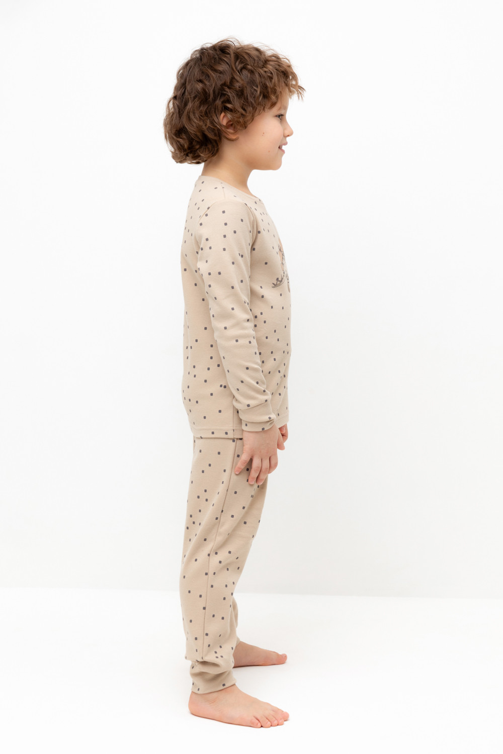 Трикотажная пижама из натурального хлопка. Джемпер с длинными втачными рукавами и брюки с эластичной резинкой в поясе. Мягкие манжеты на рукавах и по низу брюк. Оригинальная набивка и принт выполнены из стойких текстильных гипоаллергенных красителей. Изделие сохраняет цвет и форму после многократных стирок. Все трикотажные полотна производятся в соответсвии с нормами швейцарского сертификата ЭкоТекс.