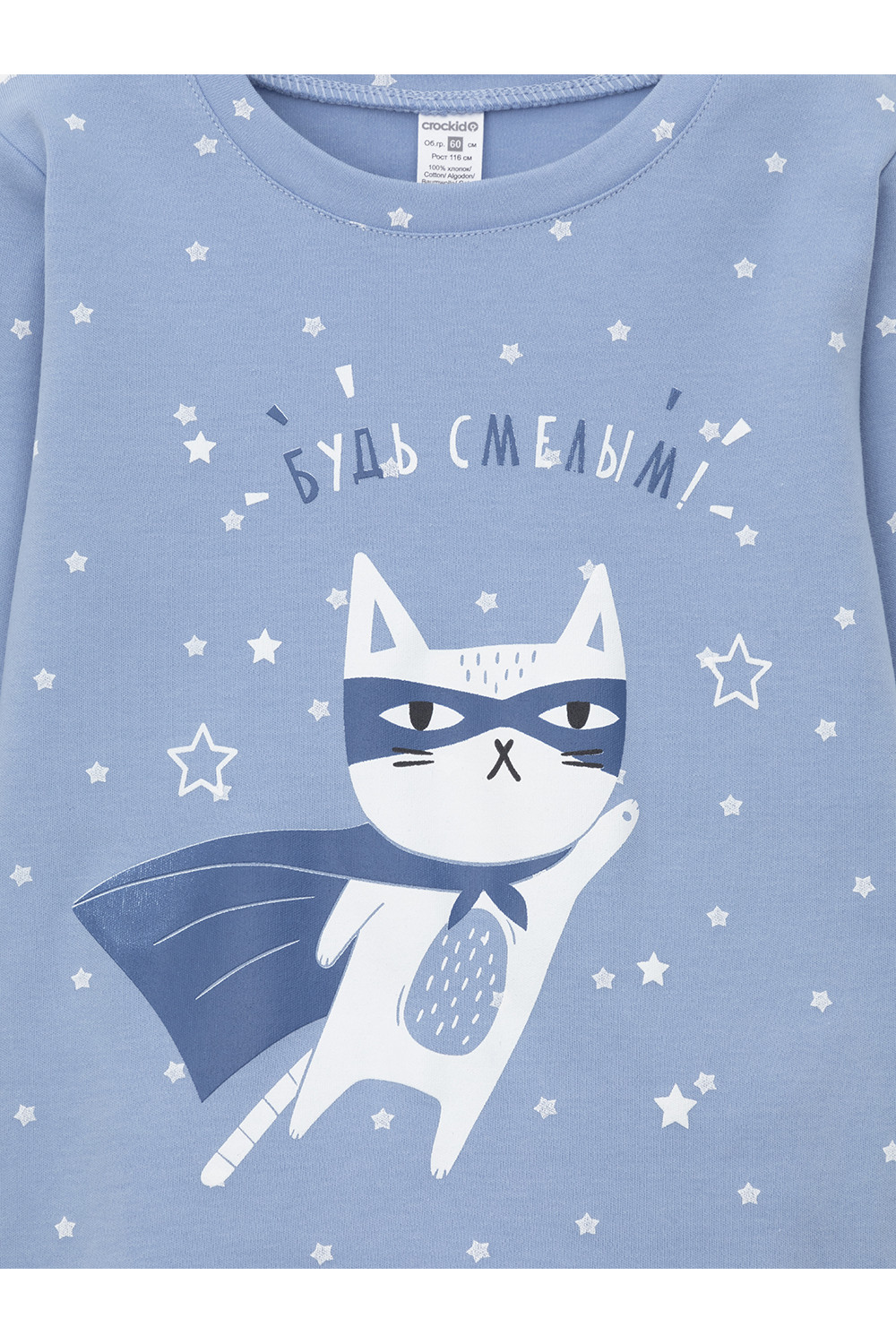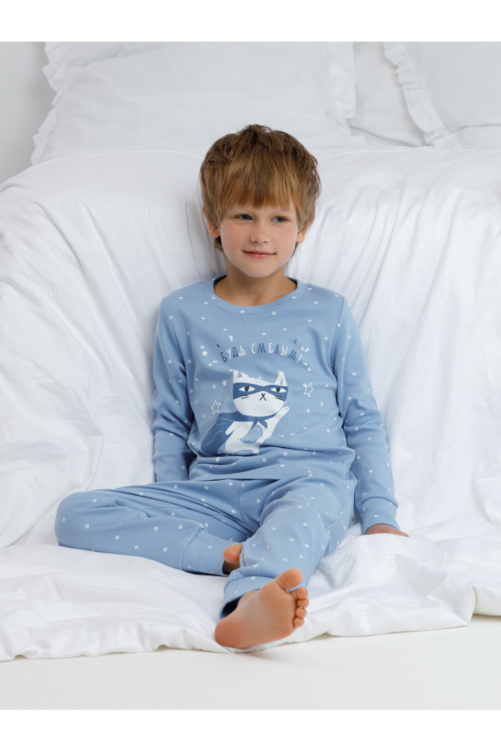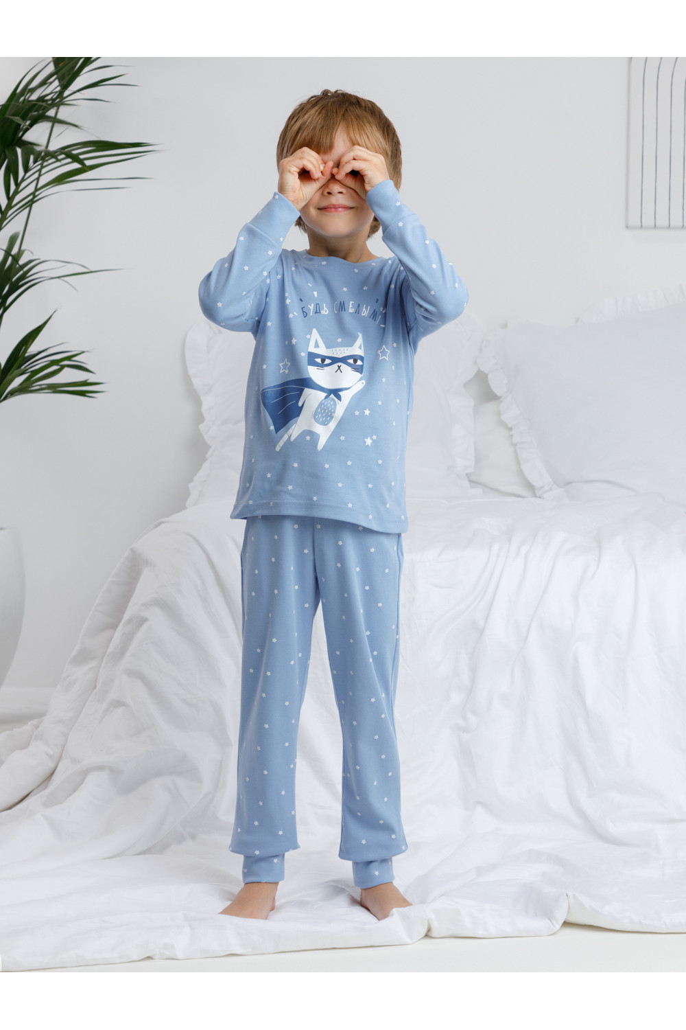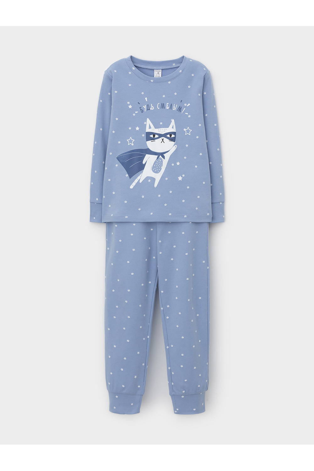 Трикотажная пижама из натурального хлопка. Джемпер с длинными втачными рукавами и брюки с эластичной резинкой в поясе. Мягкие манжеты на рукавах и по низу брюк. Оригинальная набивка и принт выполнены из стойких текстильных гипоаллергенных красителей. Изделие сохраняет цвет и форму после многократных стирок. Все трикотажные полотна производятся в соответствии с нормами швейцарского сертификата ЭкоТекс.