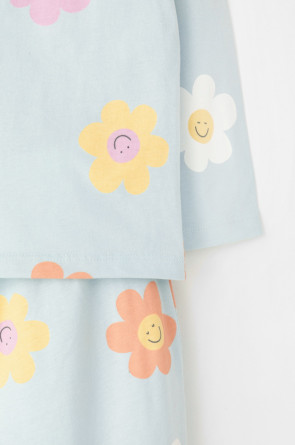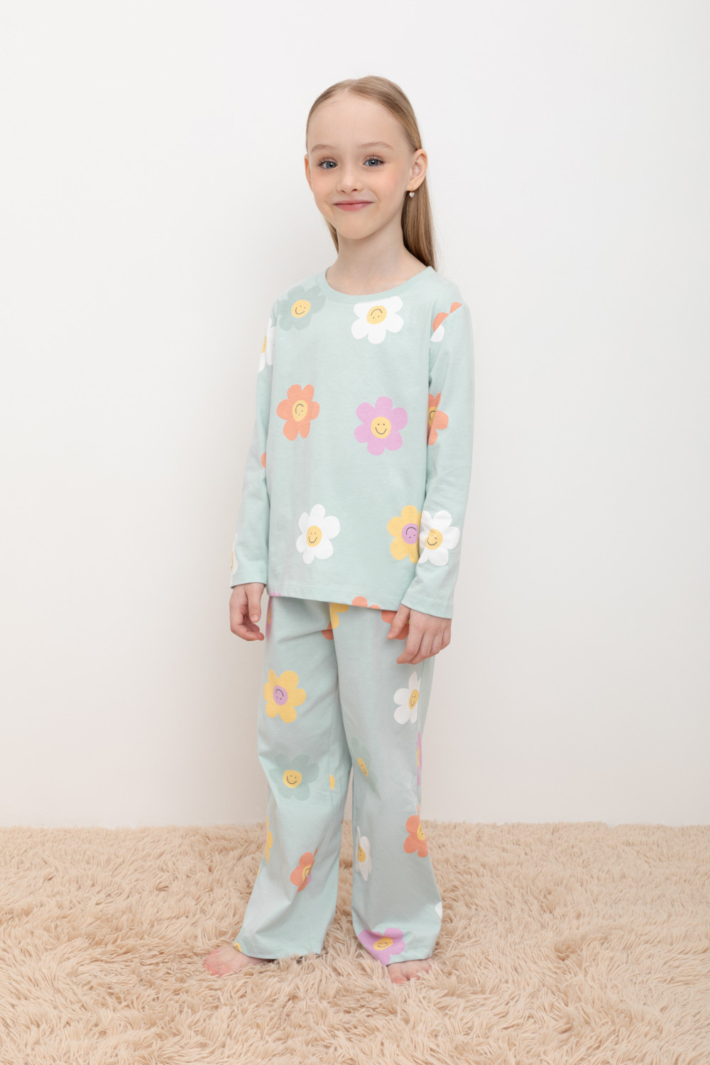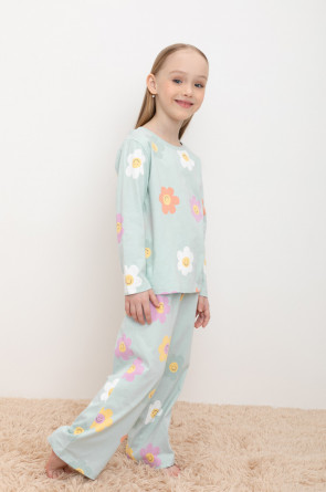 Трикотажная пижама из натурального хлопка. Джемпер с длинными втачными рукавами. У брюк в комплекте мягкий, эластичный пояс на резинке, регулируется с помощью ленты. Оригинальная набивка выполнена из стойких, гипоаллергенных текстильных красителей. Комплект сохраняет цвет и форму после многократных стирок. Все трикотажные полотна производятся в соответсвии с нормами Швейцарского сертификата ЭкоТекс.
