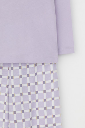 Пижама для девочки из натурального хлопка. Джемпер с длинными втачными рукавами и прямые брюки с эластичной резинкой в поясе. Оригинальная набивка и принт выполнены из стойких текстильных гипоаллергенных красителей. Изделие сохраняет цвет и форму после многократных стирок. Все трикотажные полотна производятся в соответствии с нормами швейцарского сертификата ЭкоТекс.