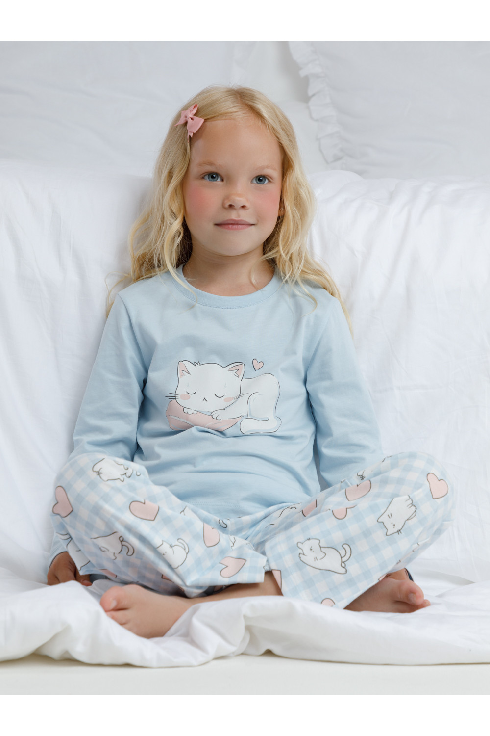 Пижама для девочки из натурального хлопка. Джемпер с длинными втачными рукавами и прямые брюки с эластичной резинкой в поясе. Оригинальная набивка и принт выполнены из стойких текстильных гипоаллергенных красителей. Изделие сохраняет цвет и форму после многократных стирок. Все трикотажные полотна производятся в соответствии с нормами швейцарского сертификата ЭкоТекс.
