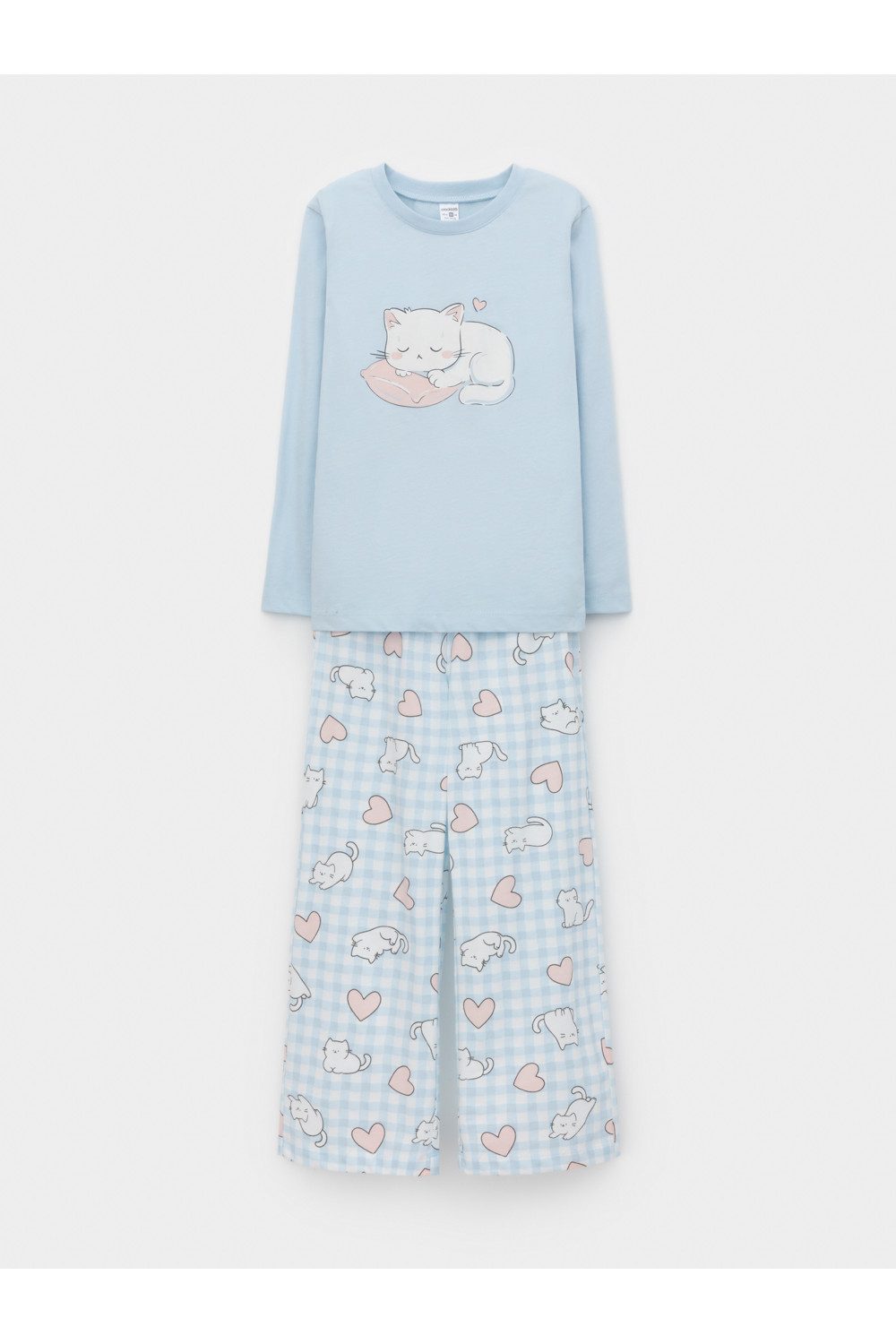 Пижама для девочки из натурального хлопка. Джемпер с длинными втачными рукавами и прямые брюки с эластичной резинкой в поясе. Оригинальная набивка и принт выполнены из стойких текстильных гипоаллергенных красителей. Изделие сохраняет цвет и форму после многократных стирок. Все трикотажные полотна производятся в соответствии с нормами швейцарского сертификата ЭкоТекс.