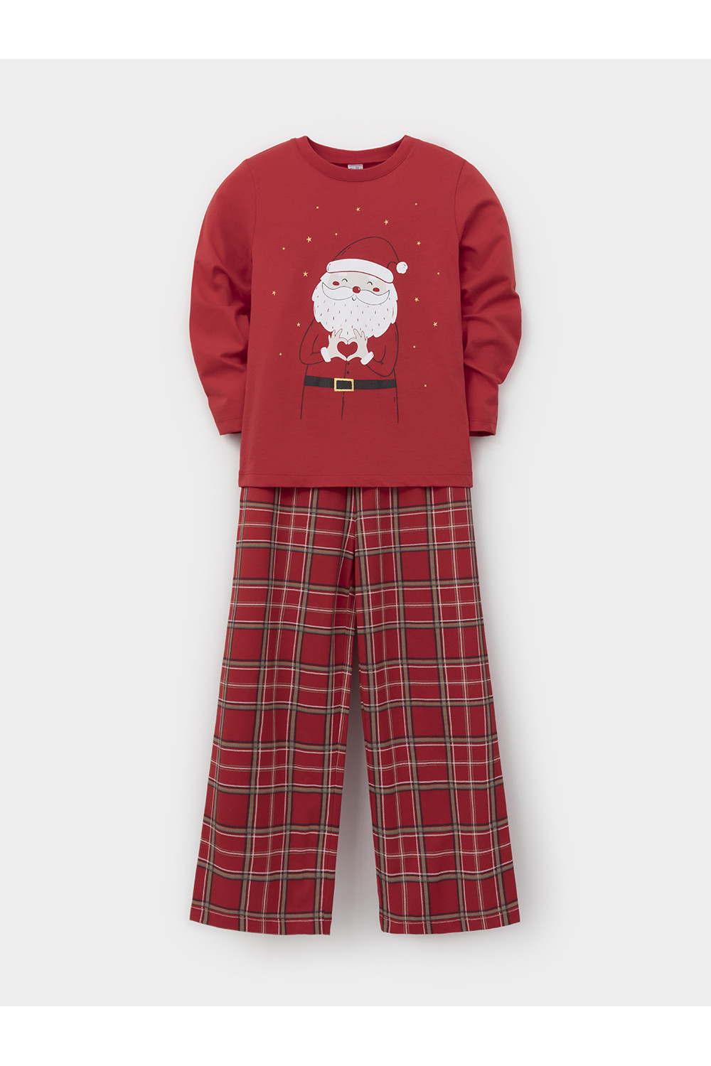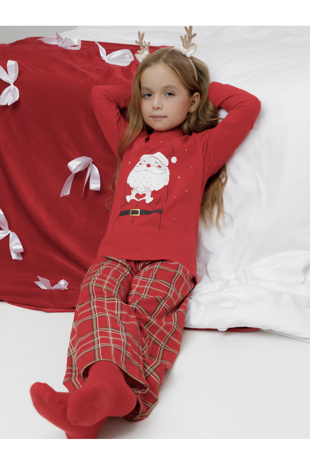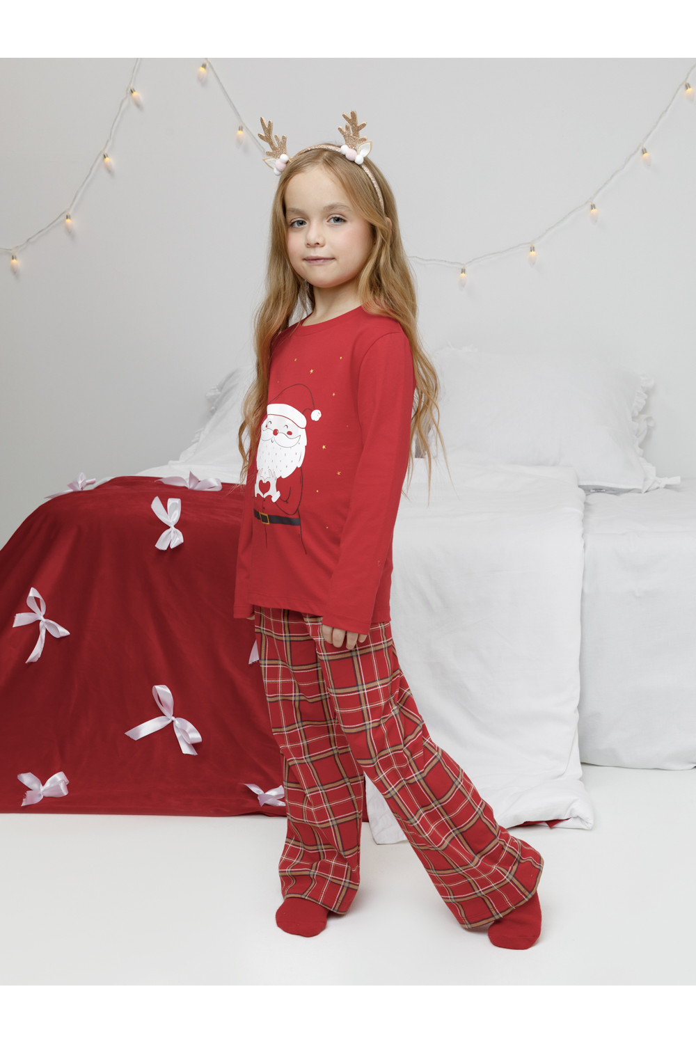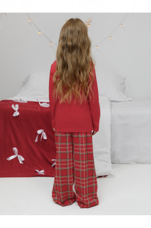 Новогодняя пижама из натурального хлопка для девочки. Джемпер с длинными втачными рукавами и прямые брюки с эластичной резинкой в поясе. Пижама отлично подойдёт для создания уютных домашних образов или в качестве подарка на Новый год и Рождество. Оригинальная набивка и принт выполнены из стойких текстильных гипоаллергенных красителей. Изделие сохраняет цвет и форму после многократных стирок. Все трикотажные полотна производятся в соответствии с нормами швейцарского сертификата ЭкоТекс.