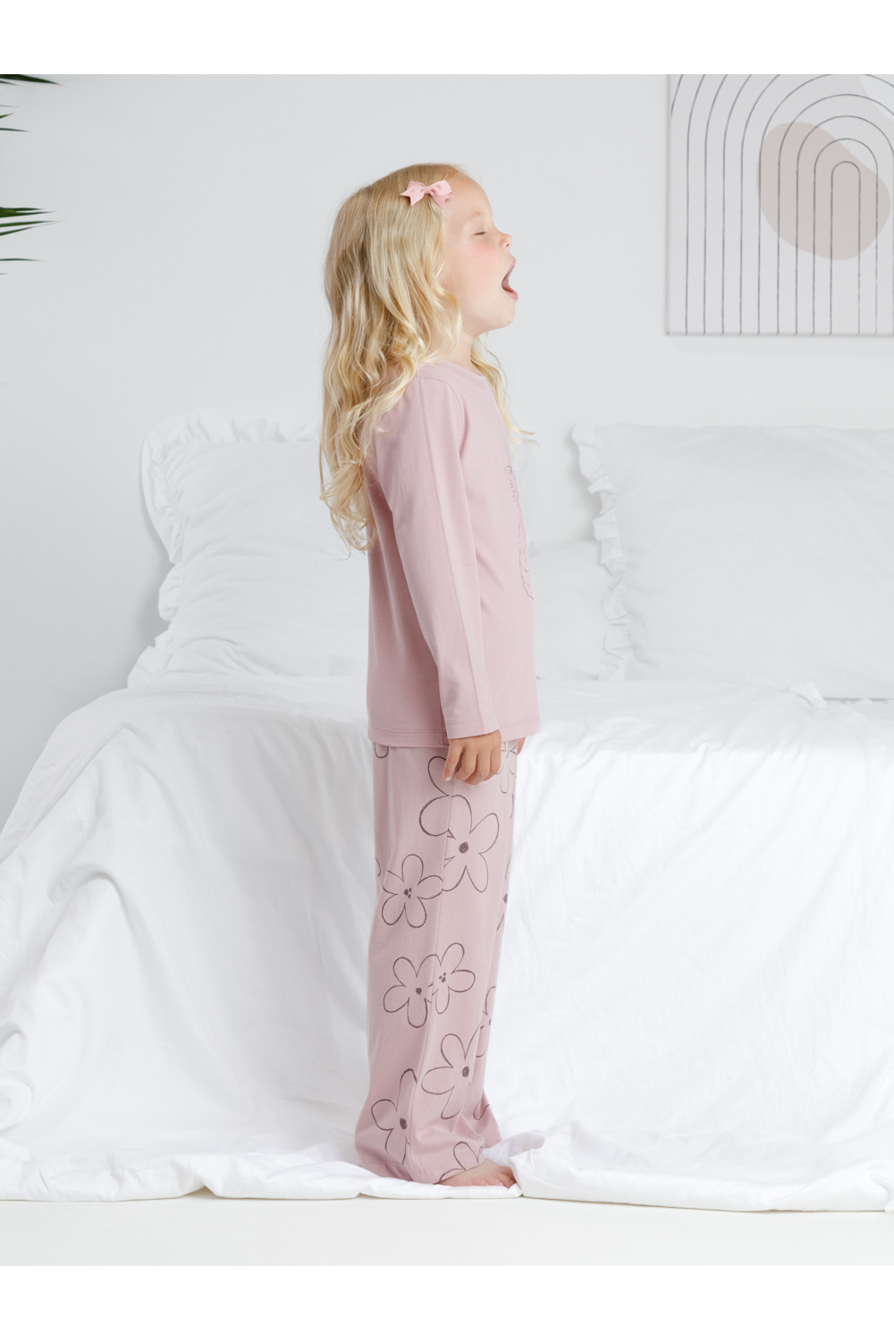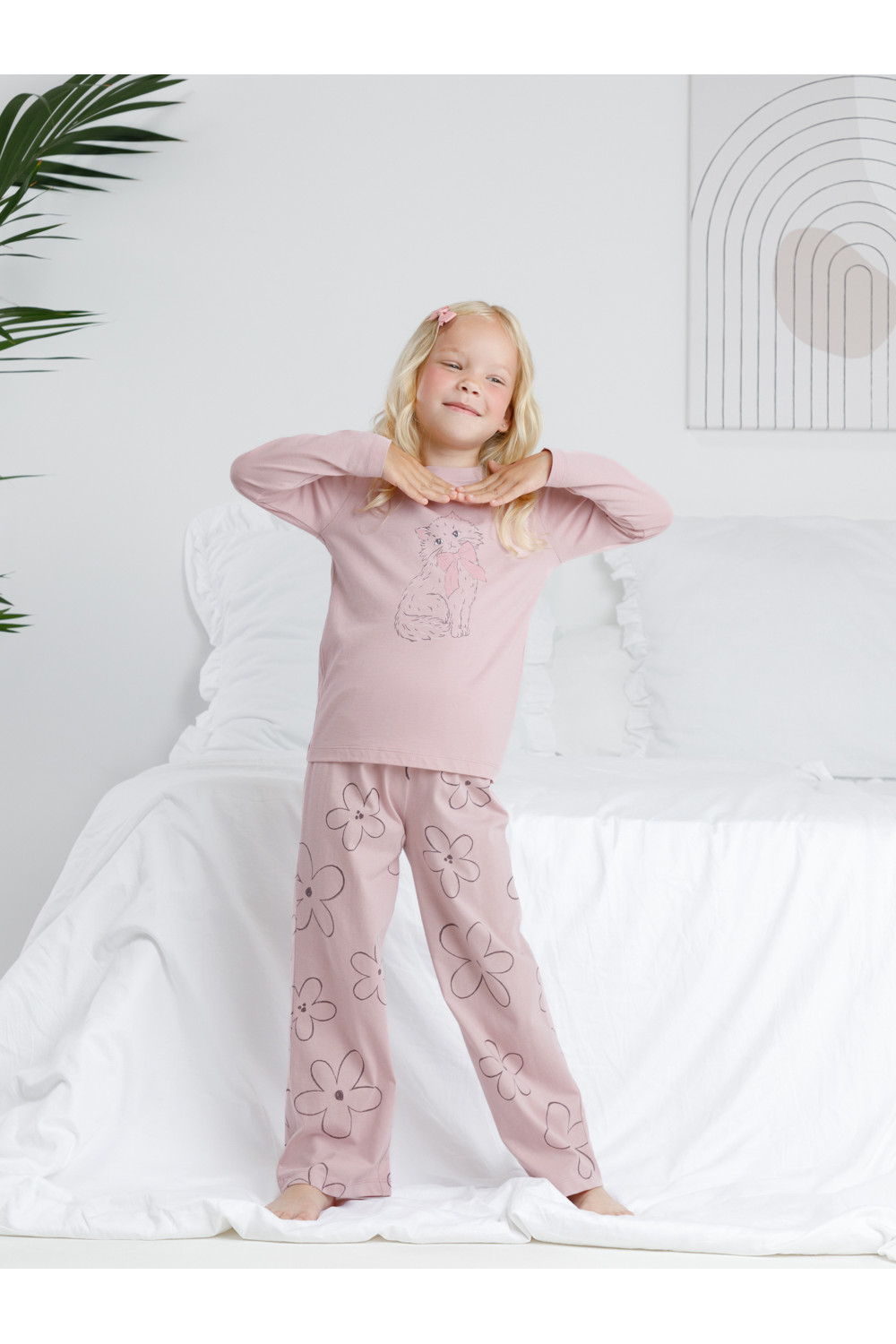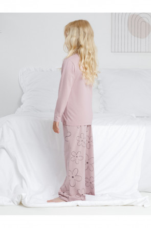 Пижама для девочки из натурального хлопка. Джемпер с длинными втачными рукавами и прямые брюки с эластичной резинкой в поясе. Оригинальная набивка и принт выполнены из стойких текстильных гипоаллергенных красителей. Изделие сохраняет цвет и форму после многократных стирок. Все трикотажные полотна производятся в соответствии с нормами швейцарского сертификата ЭкоТекс.