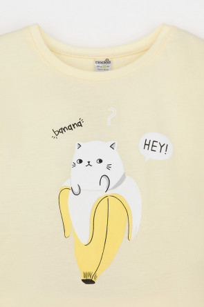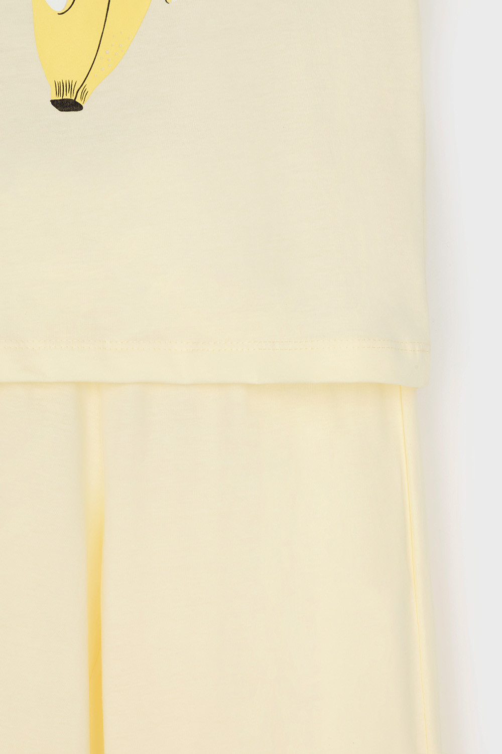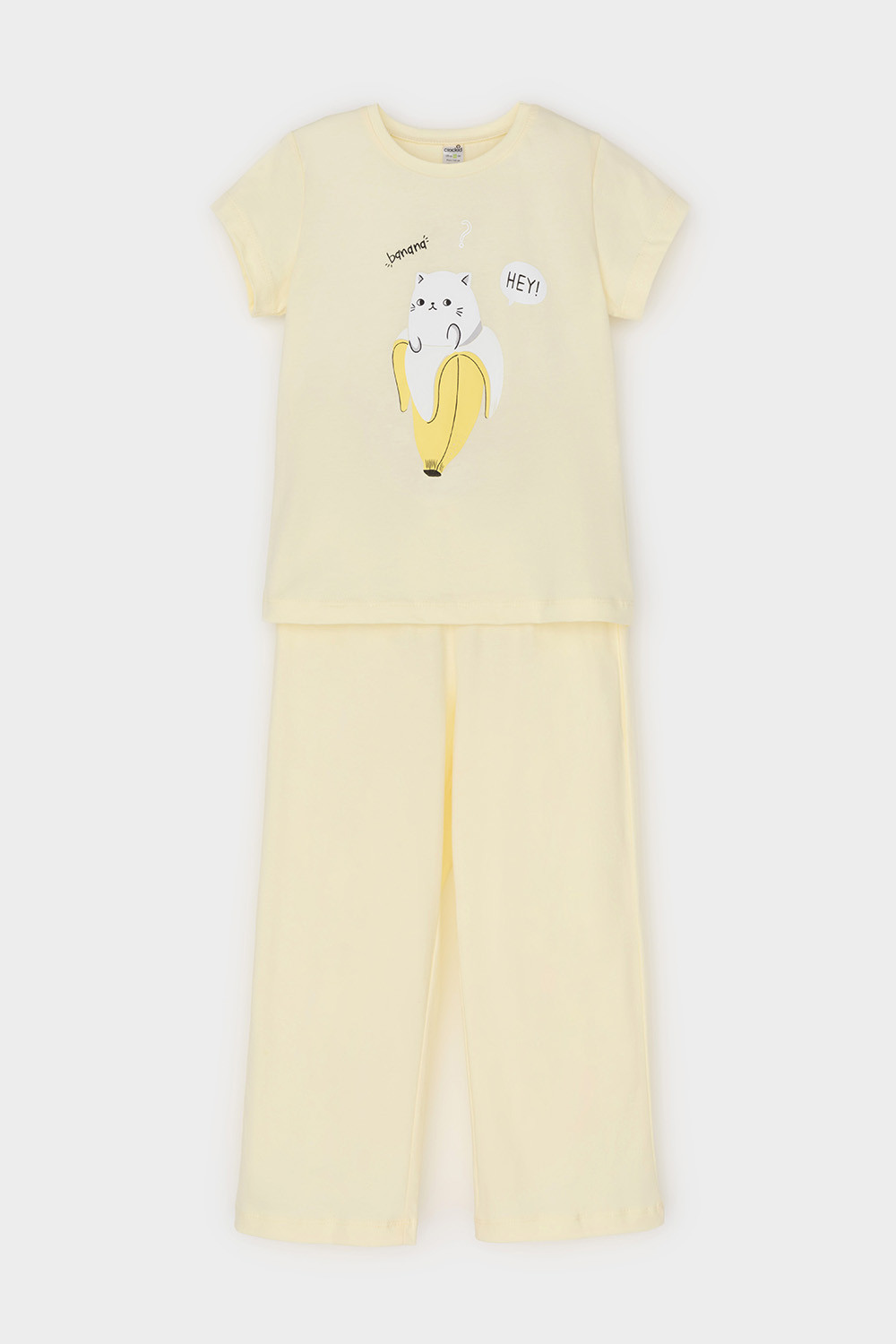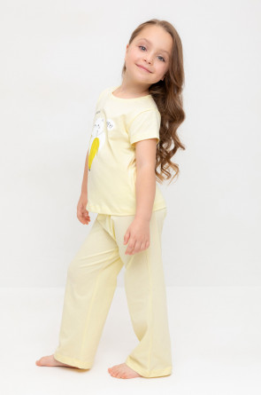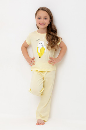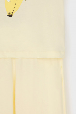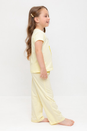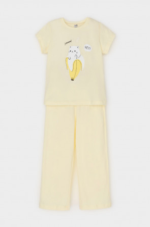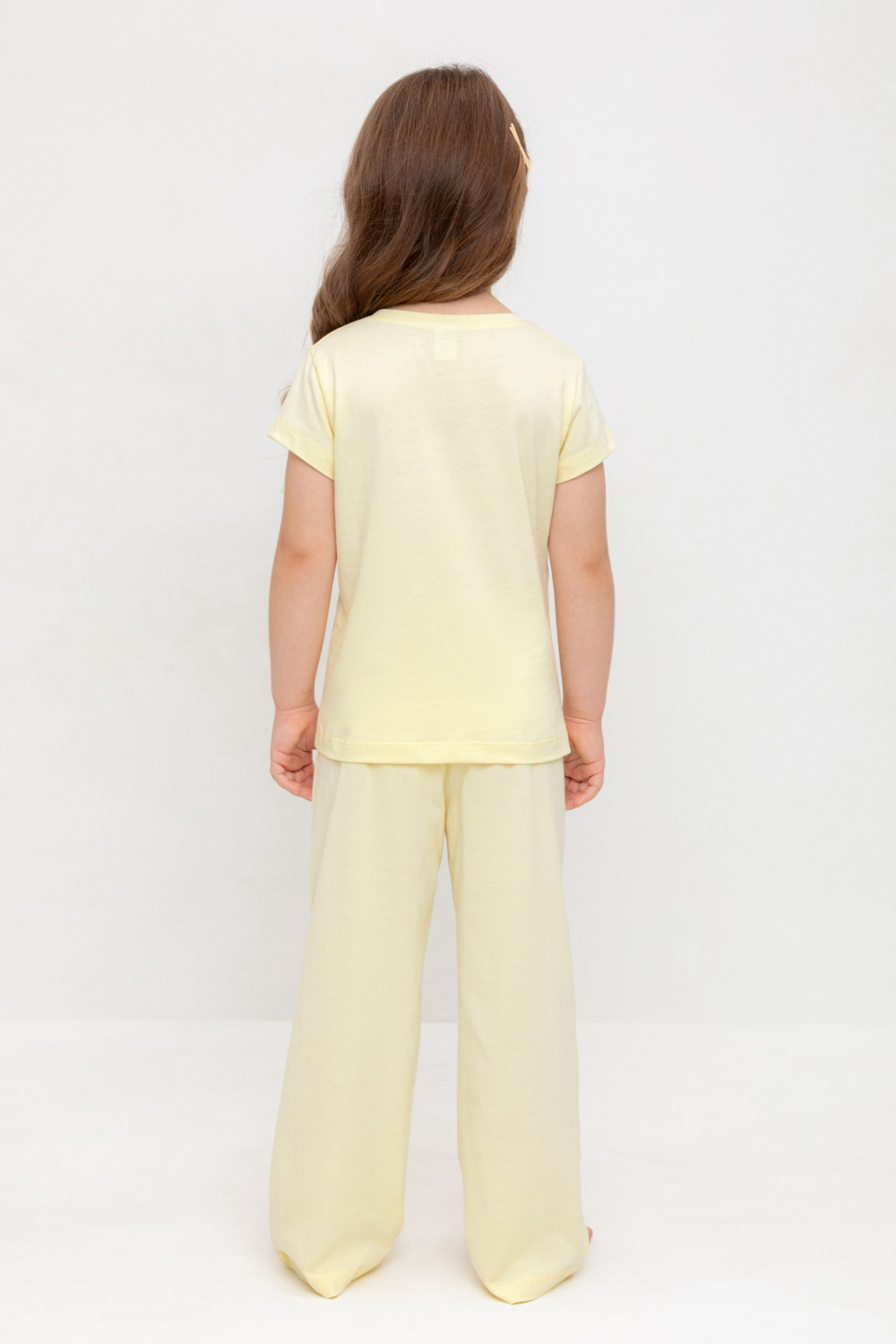 Трикотажный пижамный комплект из натурального хлопка. У футболки короткие втачные рукава и эластичная мягкая горловина. Брюки с удобным поясом на резинке, внизу манжеты. Оригинальный принт выполнен из стойких, гипоаллергенных текстильных красителей. Все трикотажные полотна производятся в соответствии с нормами Швейцарского сертификата ЭкоТекс.