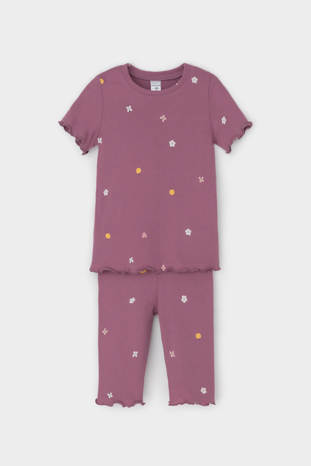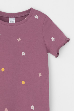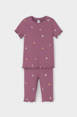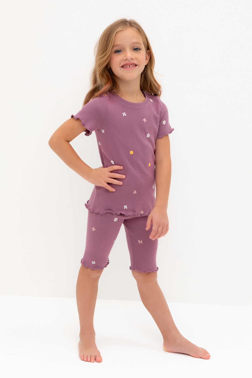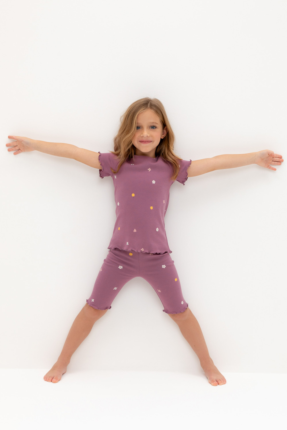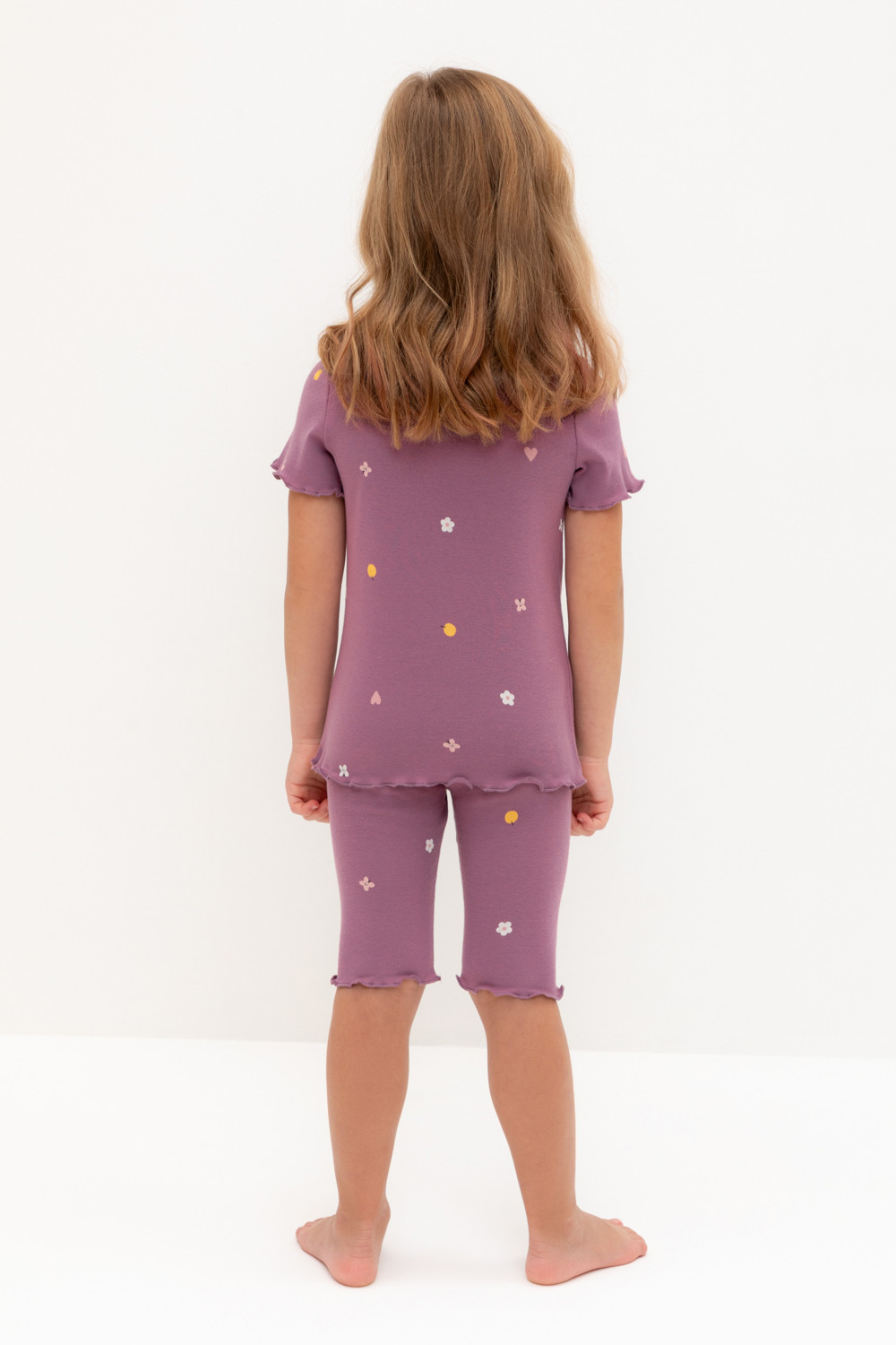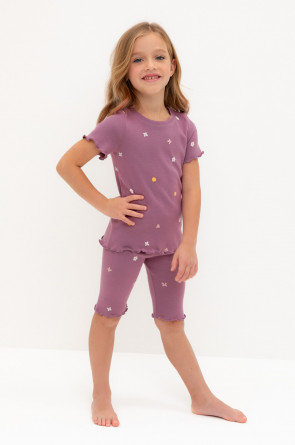 Трикотажная пижама в рубчик из натурального хлопка. Футболка с короткими втачными рукавами и шорты с эластичной резинкой в поясе. Оригинальная набивка выполнена из стойких текстильных гипоаллергенных красителей. Изделие сохраняет цвет и форму после многократных стирок. Все трикотажные полотна производятся в соответсвии с нормами швейцарского сертификата ЭкоТекс.