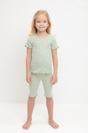 Трикотажная пижама в рубчик из натурального хлопка. Футболка с короткими втачными рукавами и шорты с эластичной резинкой в поясе. Оригинальная набивка выполнена из стойких текстильных гипоаллергенных красителей. Изделие сохраняет цвет и форму после многократных стирок. Все трикотажные полотна производятся в соответсвии с нормами швейцарского сертификата ЭкоТекс.