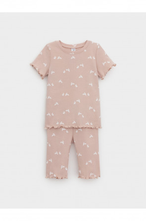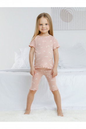 Трикотажная пижама в рубчик из натурального хлопка. Футболка с короткими втачными рукавами и шорты с эластичной резинкой в поясе. Оригинальная набивка выполнена из стойких текстильных гипоаллергенных красителей. Изделие сохраняет цвет и форму после многократных стирок. Все трикотажные полотна производятся в соответсвии с нормами швейцарского сертификата ЭкоТекс.