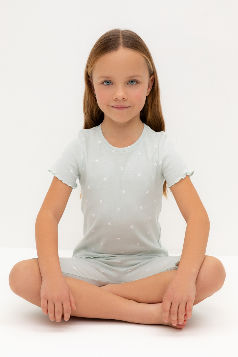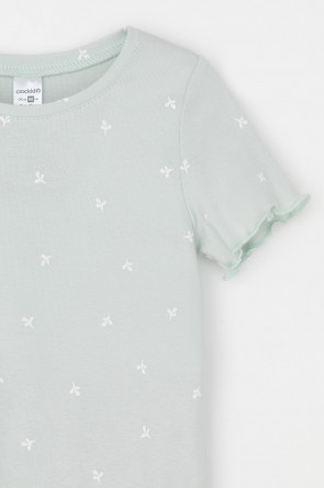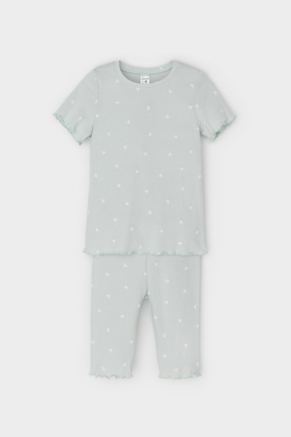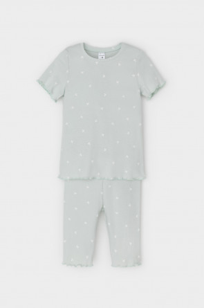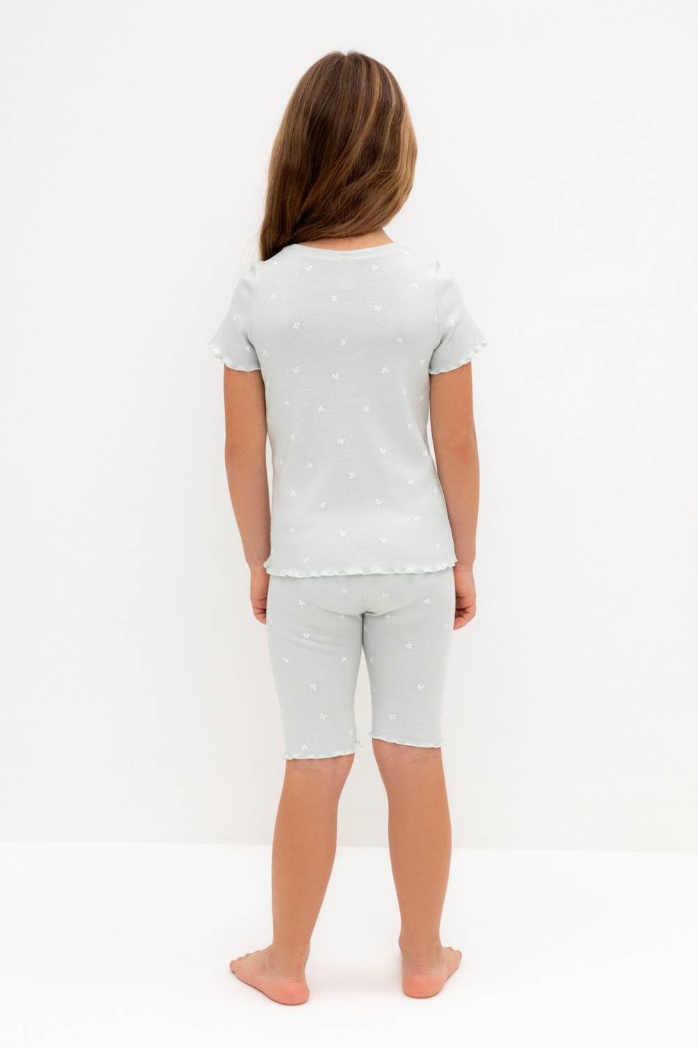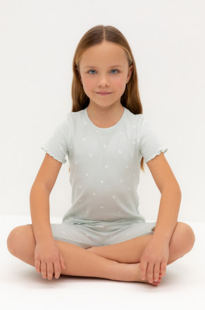 Трикотажная пижама в рубчик из натурального хлопка. Футболка с короткими втачными рукавами и шорты с эластичной резинкой в поясе. Оригинальная набивка выполнена из стойких текстильных гипоаллергенных красителей. Изделие сохраняет цвет и форму после многократных стирок. Все трикотажные полотна производятся в соответсвии с нормами швейцарского сертификата ЭкоТекс.
