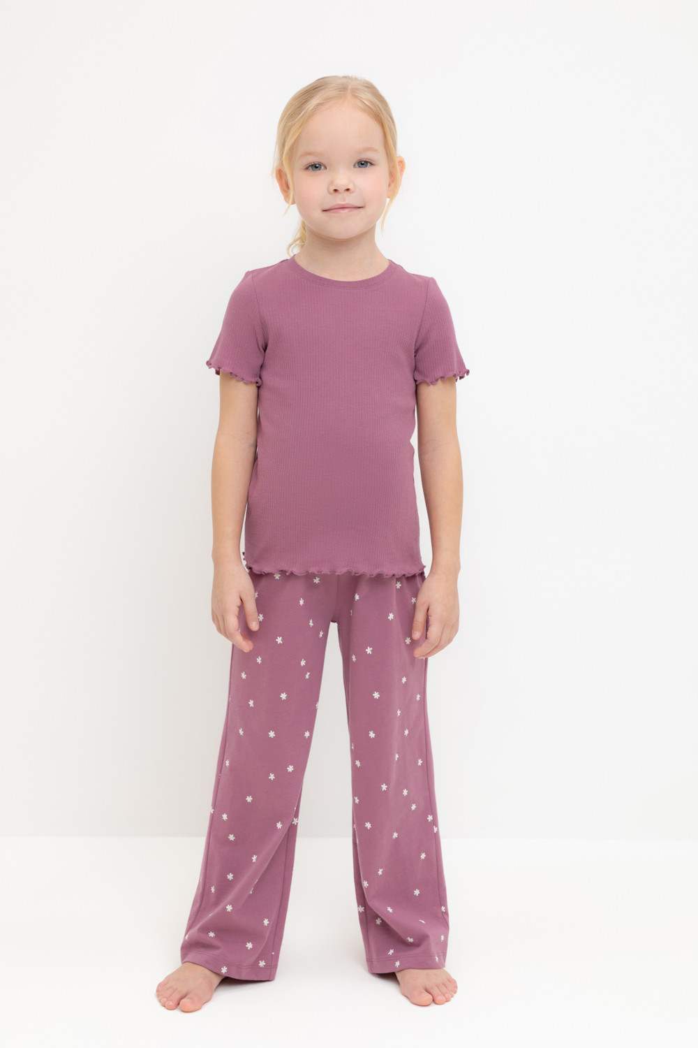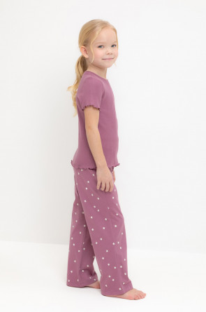 Трикотажная пижама из натурального хлопка. Футболка с короткими втачными рукавами изготовлена из эластичного трикотажа в рубчик. Брюки с эластичной резинкой в поясе выполнены из гладкого трикотажа супрем. Оригинальная набивка выполнена из стойких текстильных гипоаллергенных красителей. Изделие сохраняет цвет и форму после многократных стирок. Все трикотажные полотна производятся в соответсвии с нормами швейцарского сертификата ЭкоТекс.