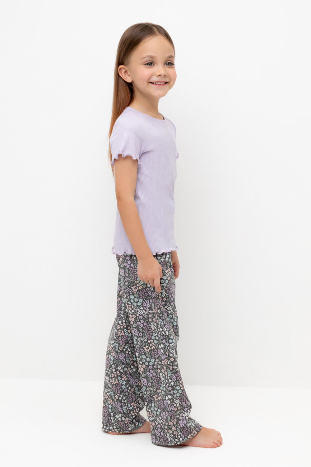 Трикотажная пижама из натурального хлопка. Футболка с короткими втачными рукавами изготовлена из эластичного трикотажа в рубчик. Брюки с эластичной резинкой в поясе выполнены из гладкого трикотажа супрем. Оригинальная набивка выполнена из стойких текстильных гипоаллергенных красителей. Изделие сохраняет цвет и форму после многократных стирок. Все трикотажные полотна производятся в соответсвии с нормами швейцарского сертификата ЭкоТекс.