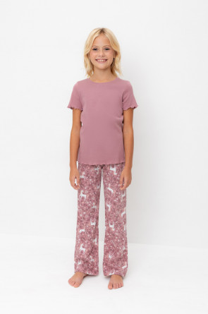 Трикотажная пижама из натурального хлопка. Футболка с короткими втачными рукавами. У футболки рукава и низ изделия обработаны микрооверлоком У брюк в комплекте мягкий, эластичный пояс на резинке. Оригинальная набивка выполнена из стойких, гипоаллергенных текстильных красителей. Комплект сохраняет цвет и форму после многократных стирок. Все трикотажные полотна производятся в соответсвии с нормами Швейцарского сертификата ЭкоТекс.