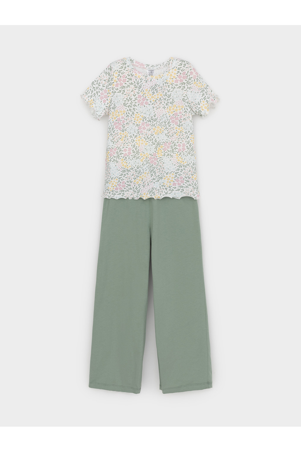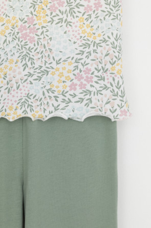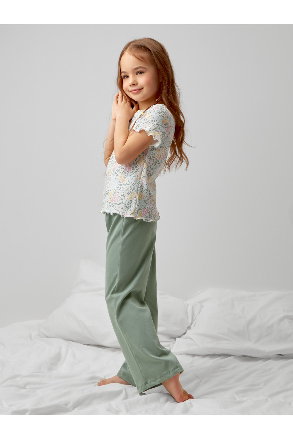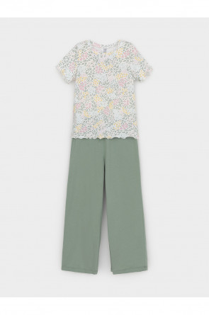 Трикотажная пижама из натурального хлопка. Футболка с короткими втачными рукавами изготовлена из эластичного трикотажа в рубчик. Брюки с эластичной резинкой в поясе выполнены из гладкого трикотажа супрем. Оригинальная набивка выполнена из стойких текстильных гипоаллергенных красителей. Изделие сохраняет цвет и форму после многократных стирок. Все трикотажные полотна производятся в соответсвии с нормами швейцарского сертификата ЭкоТекс.