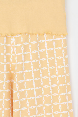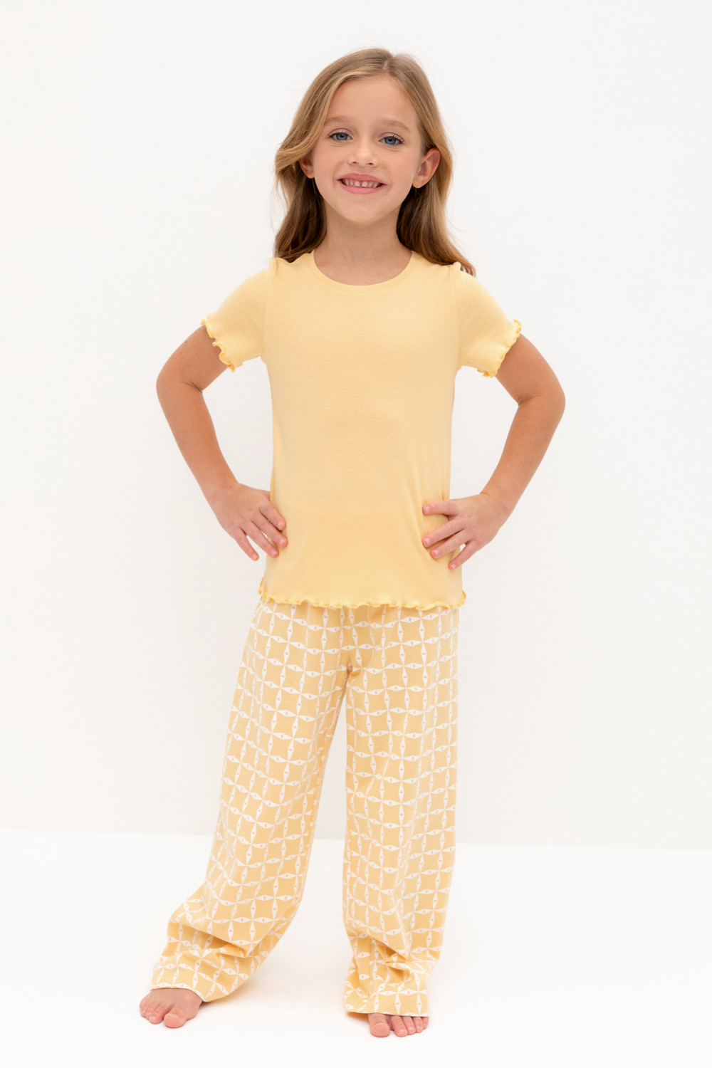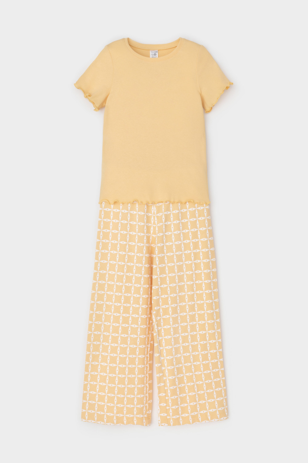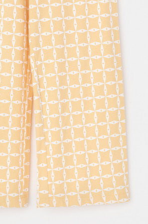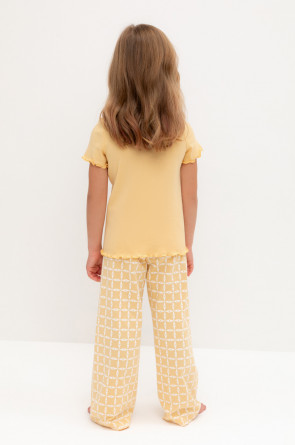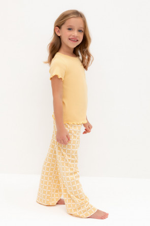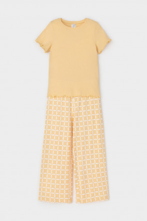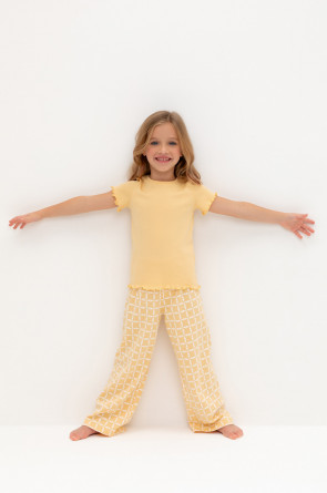 Трикотажная пижама из натурального хлопка. Футболка с короткими втачными рукавами изготовлена из эластичного трикотажа в рубчик. Брюки с эластичной резинкой в поясе выполнены из гладкого трикотажа супрем. Оригинальная набивка выполнена из стойких текстильных гипоаллергенных красителей. Изделие сохраняет цвет и форму после многократных стирок. Все трикотажные полотна производятся в соответсвии с нормами швейцарского сертификата ЭкоТекс.