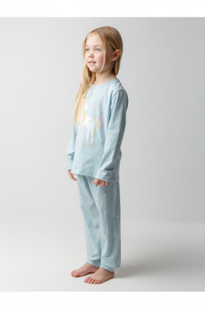 Трикотажная пижама из натурального хлопка. Джемпер с длинными втачными рукавами и брюки с эластичной резинкой в поясе. Мягкие манжеты по низу брюк. Оригинальные набивка и принт выполнены из стойких гипоаллергенных текстильных гипоаллергенных красителей. Изделие сохраняет цвет и форму после многократных стирок. Все трикотажные полотна производятся в соответсвии с нормами швейцарского сертификата ЭкоТекс.