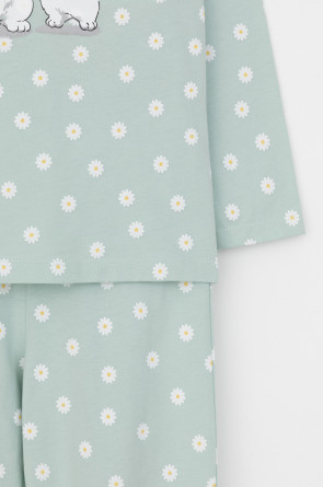 Трикотажная пижама из натурального хлопка. Джемпер с длинными втачными рукавами и брюки с эластичной резинкой в поясе. Мягкие манжеты по низу брюк. Оригинальные набивка и принт выполнены из стойких гипоаллергенных текстильных гипоаллергенных красителей. Изделие сохраняет цвет и форму после многократных стирок. Все трикотажные полотна производятся в соответсвии с нормами швейцарского сертификата ЭкоТекс.
