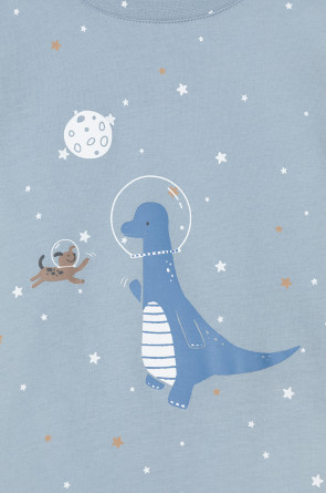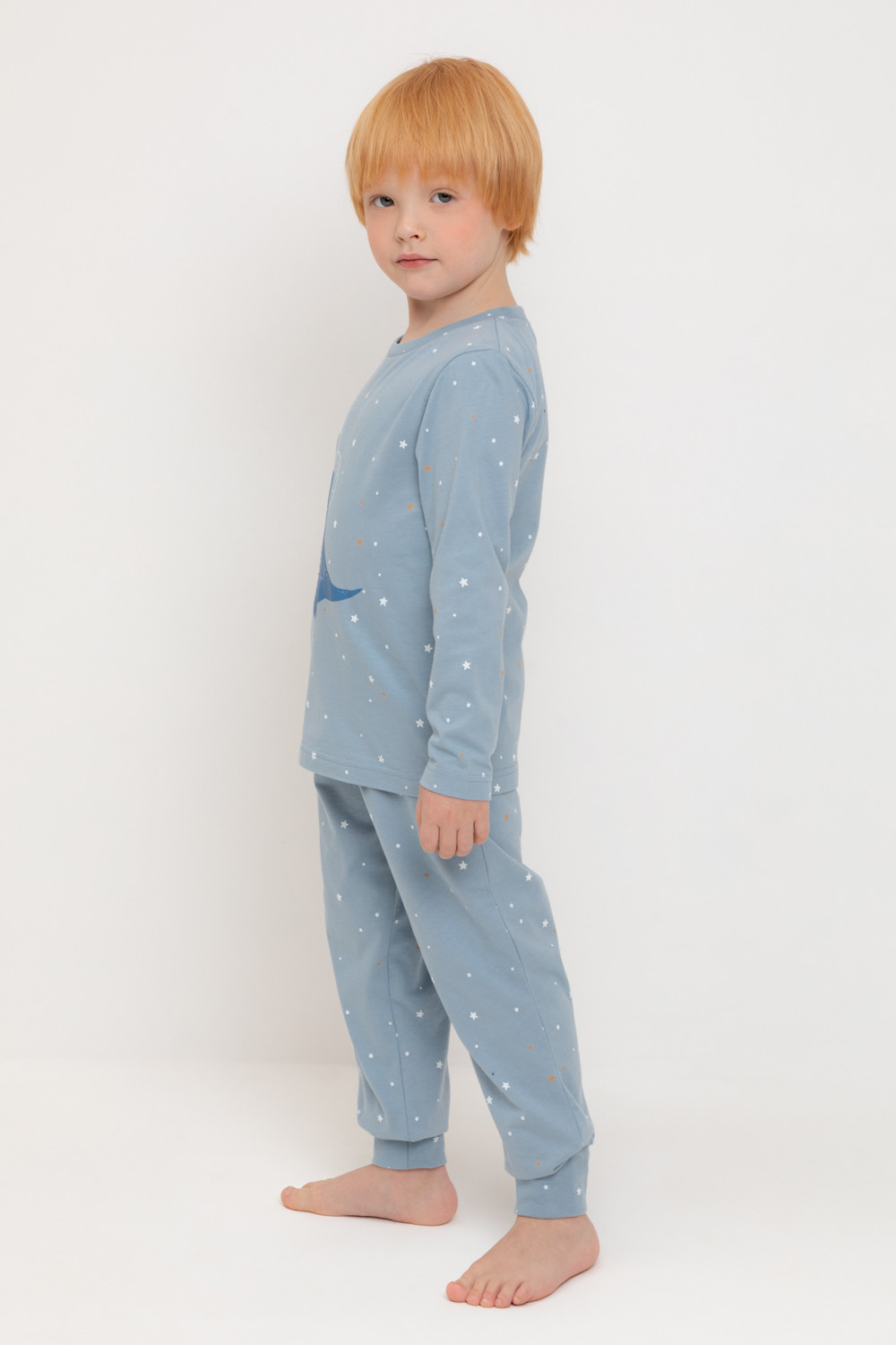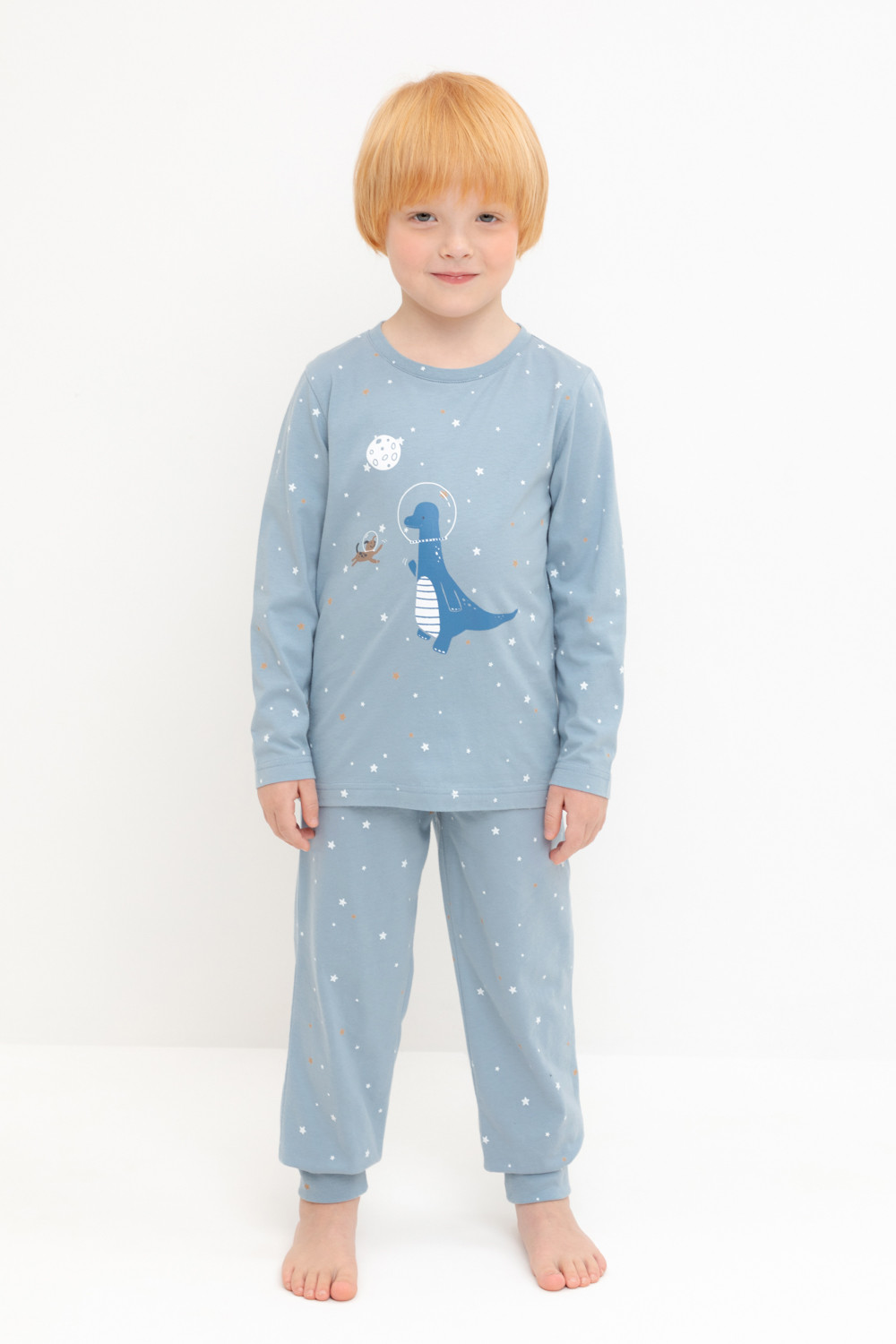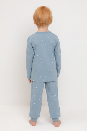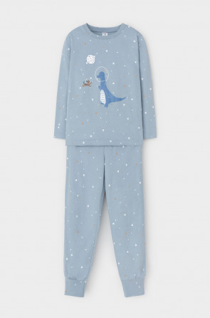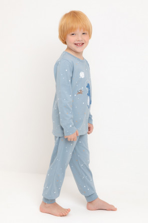 Трикотажная пижама из натурального хлопка. Джемпер с длинными втачными рукавами и брюки с эластичной резинкой в поясе. Мягкие манжеты по низу брюк. Оригинальные набивка и принт выполнены из стойких гипоаллергенных текстильных гипоаллергенных красителей. Изделие сохраняет цвет и форму после многократных стирок. Все трикотажные полотна производятся в соответсвии с нормами швейцарского сертификата ЭкоТекс.
