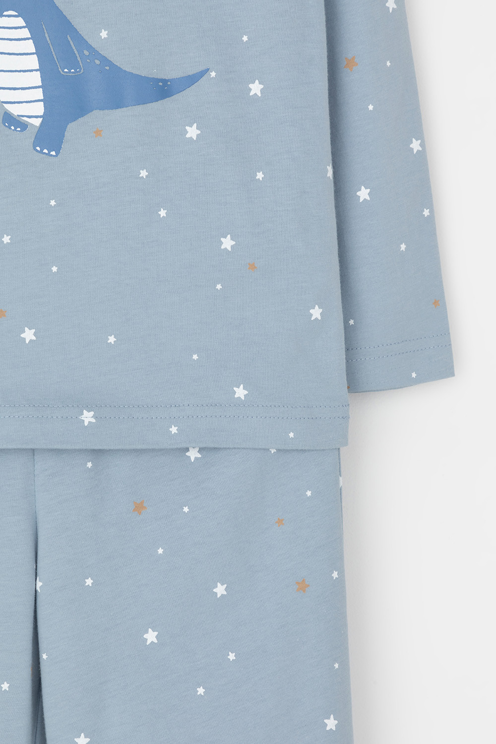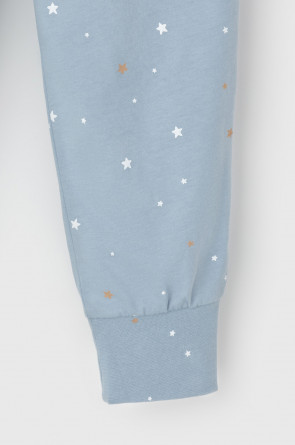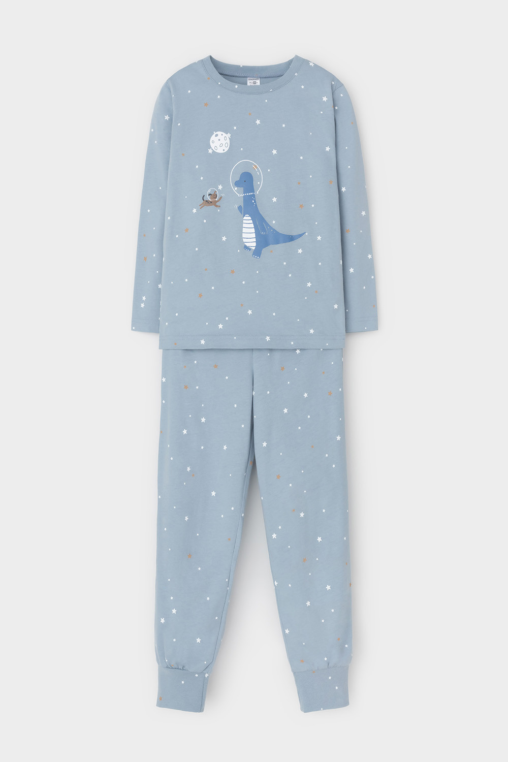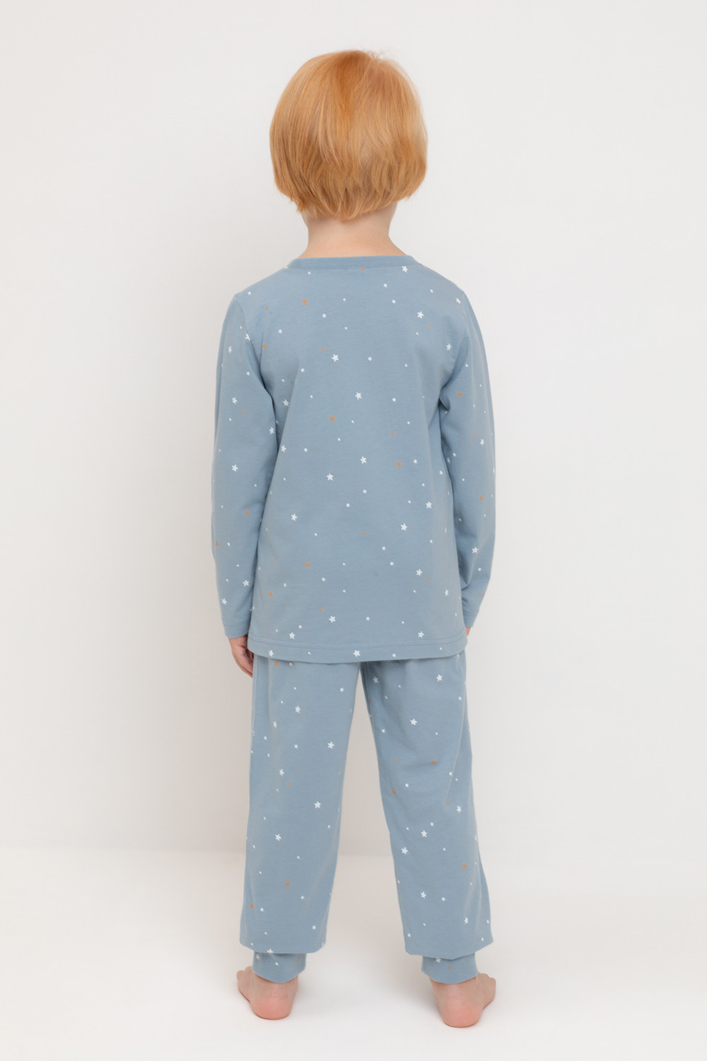 Трикотажная пижама из натурального хлопка. Джемпер с длинными втачными рукавами и брюки с эластичной резинкой в поясе. Мягкие манжеты по низу брюк. Оригинальные набивка и принт выполнены из стойких гипоаллергенных текстильных гипоаллергенных красителей. Изделие сохраняет цвет и форму после многократных стирок. Все трикотажные полотна производятся в соответсвии с нормами швейцарского сертификата ЭкоТекс.