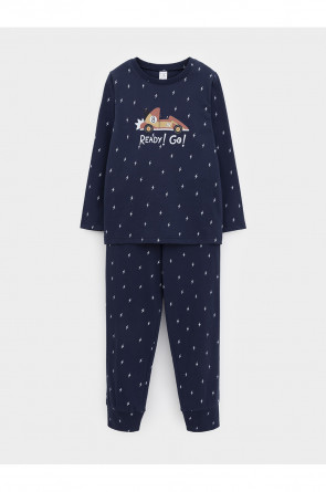 Пижама для мальчика из натурального хлопка. Джемпер с длинными втачными рукавами и брюки с эластичной резинкой в поясе. Мягкие манжеты по низу брюк сделаны из материала в рубчик. Оригинальная набивка и принт выполнены из стойких текстильных гипоаллергенных красителей. Изделие сохраняет цвет и форму после многократных стирок. Все трикотажные полотна производятся в соответствии с нормами швейцарского сертификата ЭкоТекс.