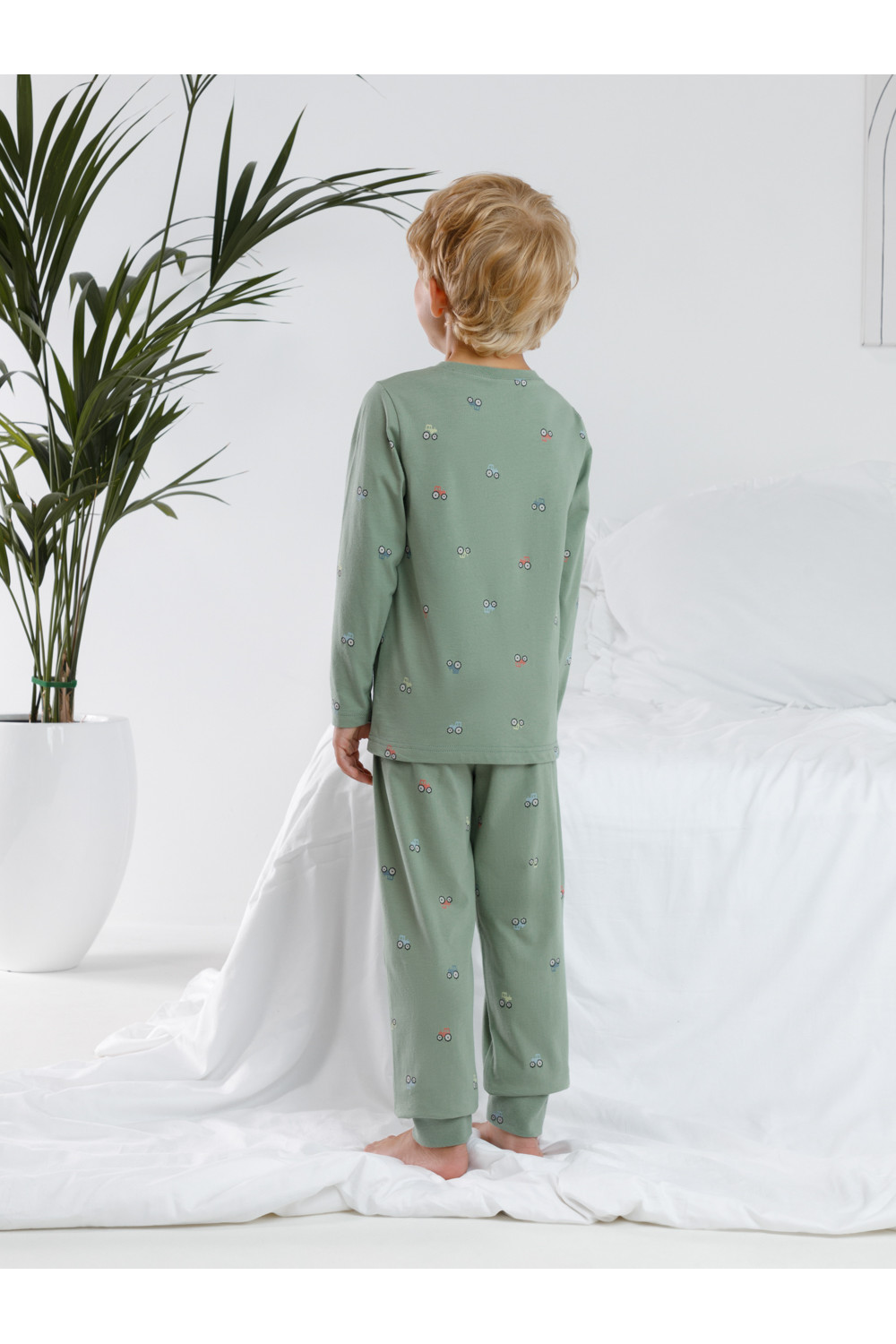 Пижама для мальчика из натурального хлопка. Джемпер с длинными втачными рукавами и брюки с эластичной резинкой в поясе. Мягкие манжеты по низу брюк сделаны из материала в рубчик. Оригинальная набивка и принт выполнены из стойких текстильных гипоаллергенных красителей. Изделие сохраняет цвет и форму после многократных стирок. Все трикотажные полотна производятся в соответствии с нормами швейцарского сертификата ЭкоТекс.