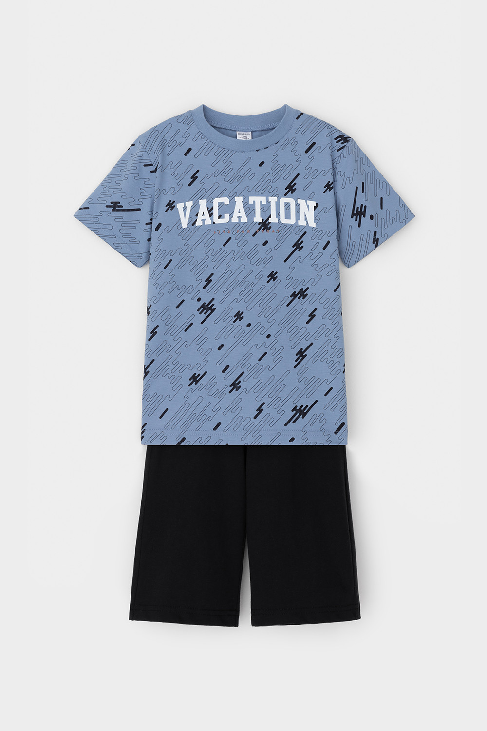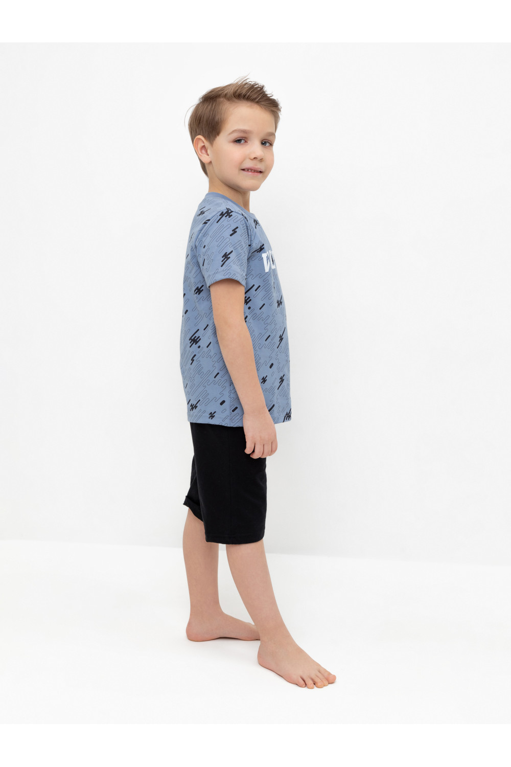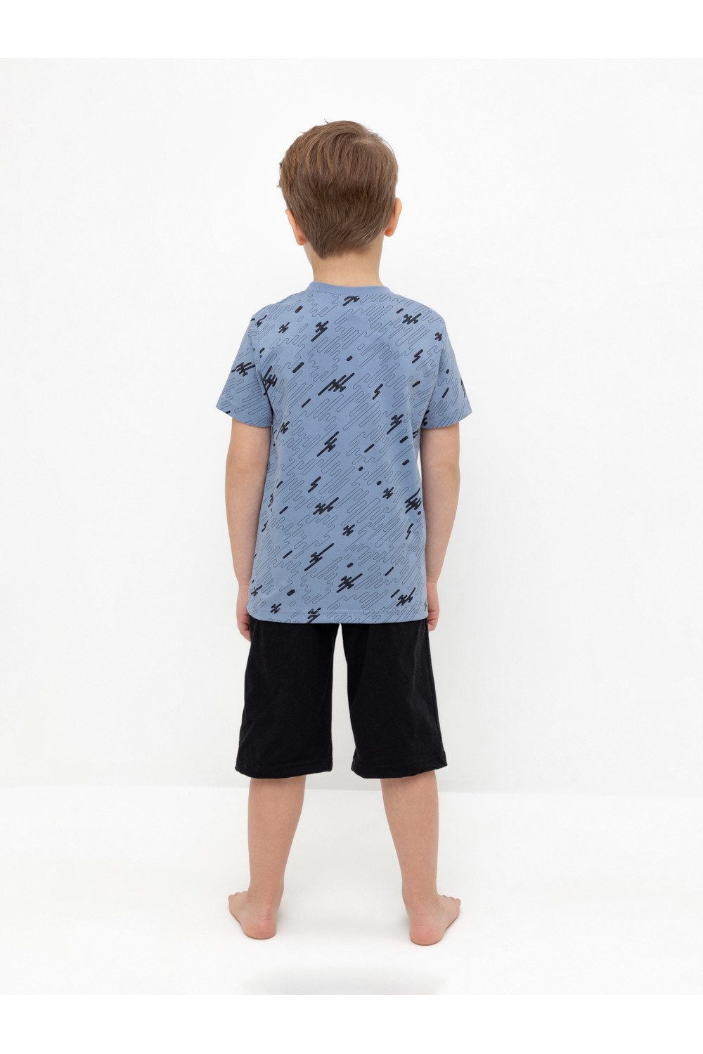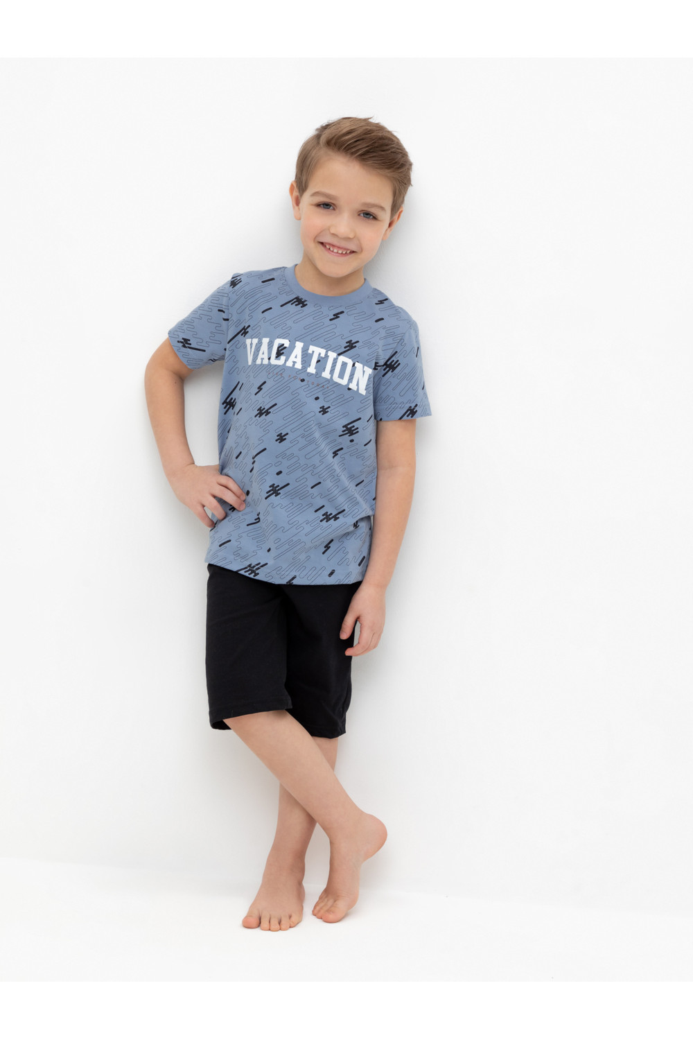 Трикотажная пижама из натурального хлопка. Футболка с короткими втачными рукавами и шорты с эластичной резинкой в поясе. Оригинальные набивка и принт выполнены из стойких гипоаллергенных текстильных гипоаллергенных красителей. Изделие сохраняет цвет и форму после многократных стирок. Все трикотажные полотна производятся в соответсвии с нормами швейцарского сертификата ЭкоТекс.