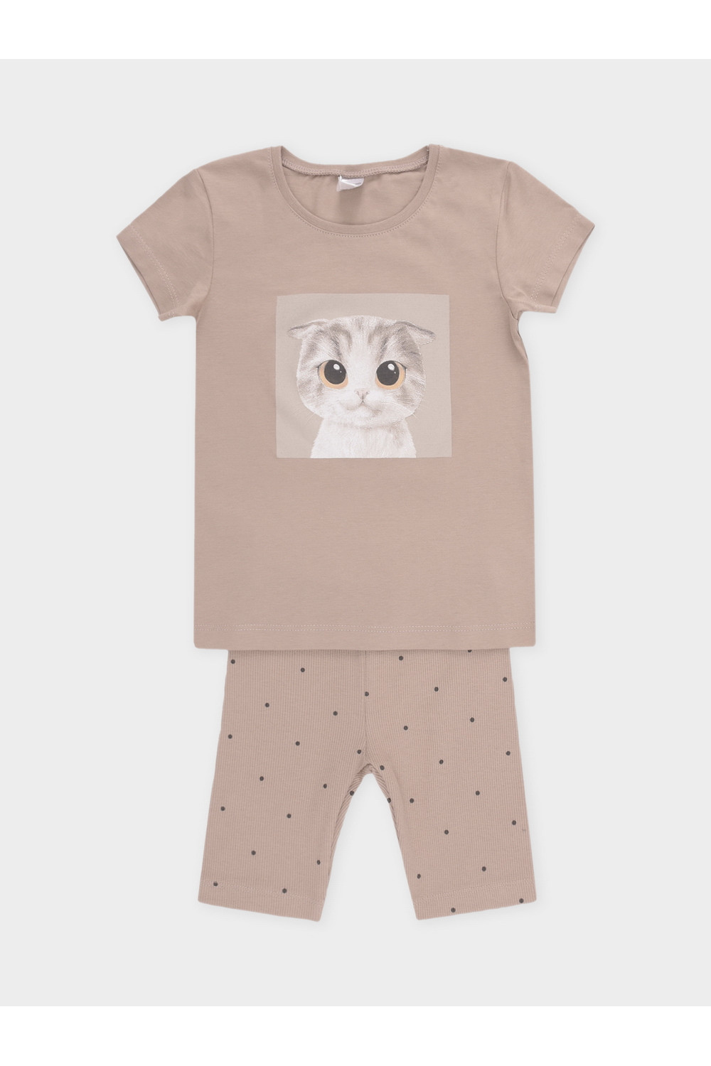 Трикотажная пижама из натурального хлопка. Удлиненная футболка с оригинальным принтом и спущенной линией плеч. У бридж в комплекте мягкий, эластичный пояс на резинке. Оригинальная набивка выполнена из стойких, гипоаллергенных текстильных красителей. Комплект сохраняет цвет и форму после многократных стирок. Все трикотажные полотна производятся в соответсвии с нормами Швейцарского сертификата ЭкоТекс.
