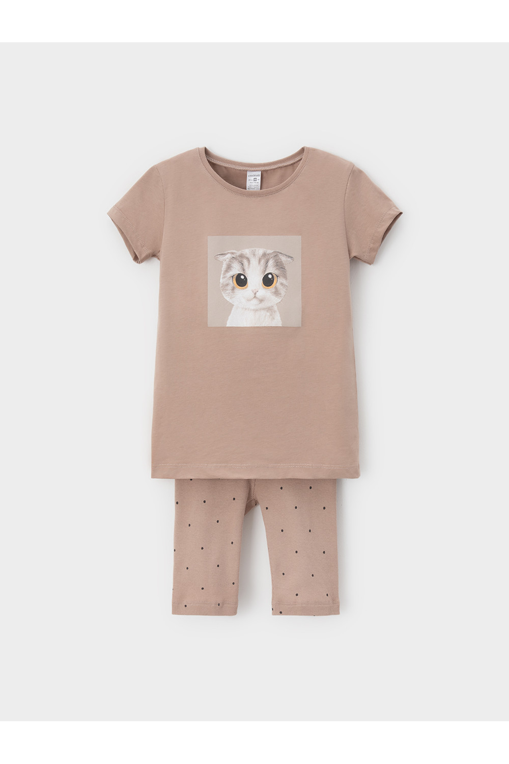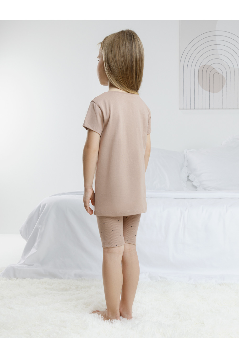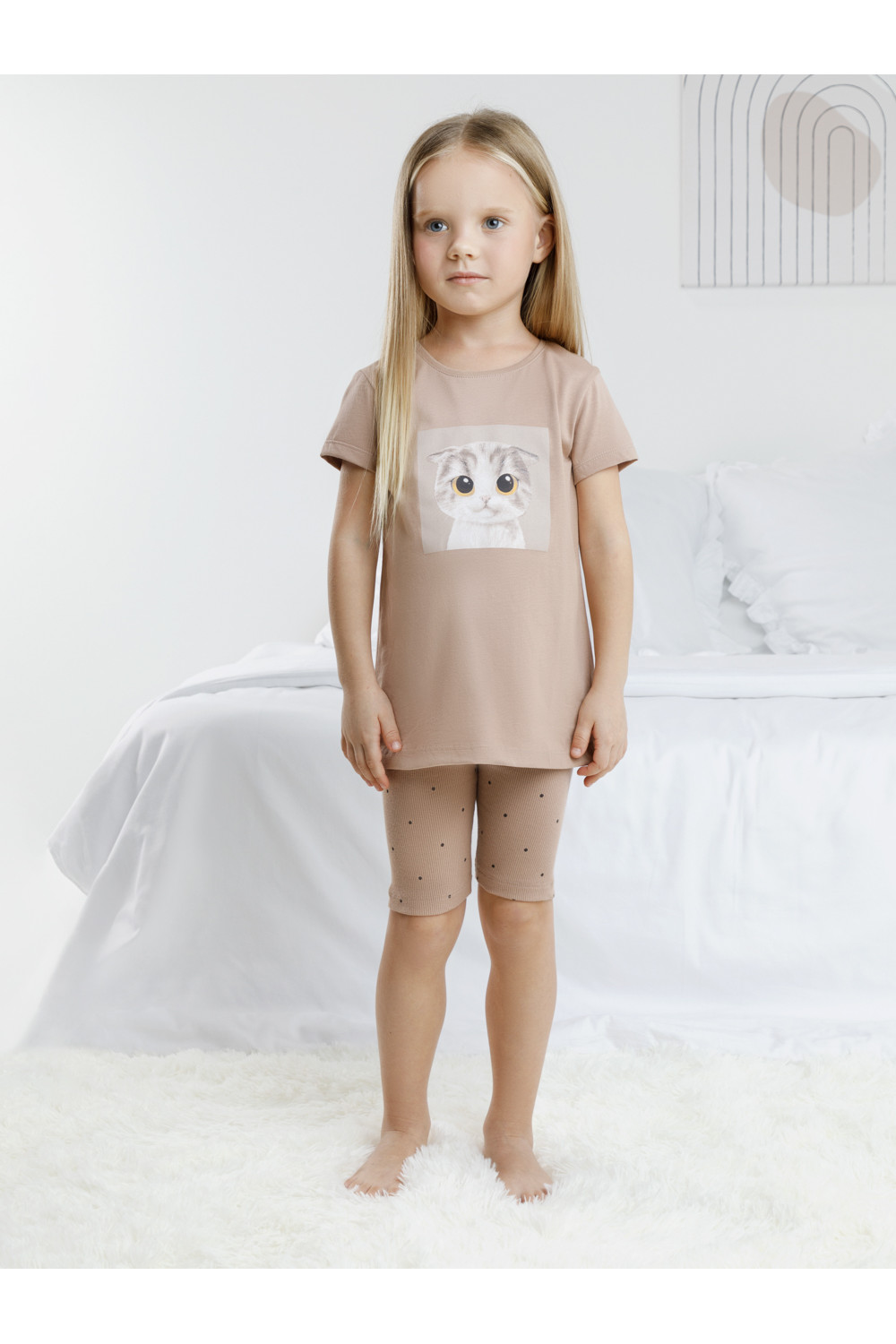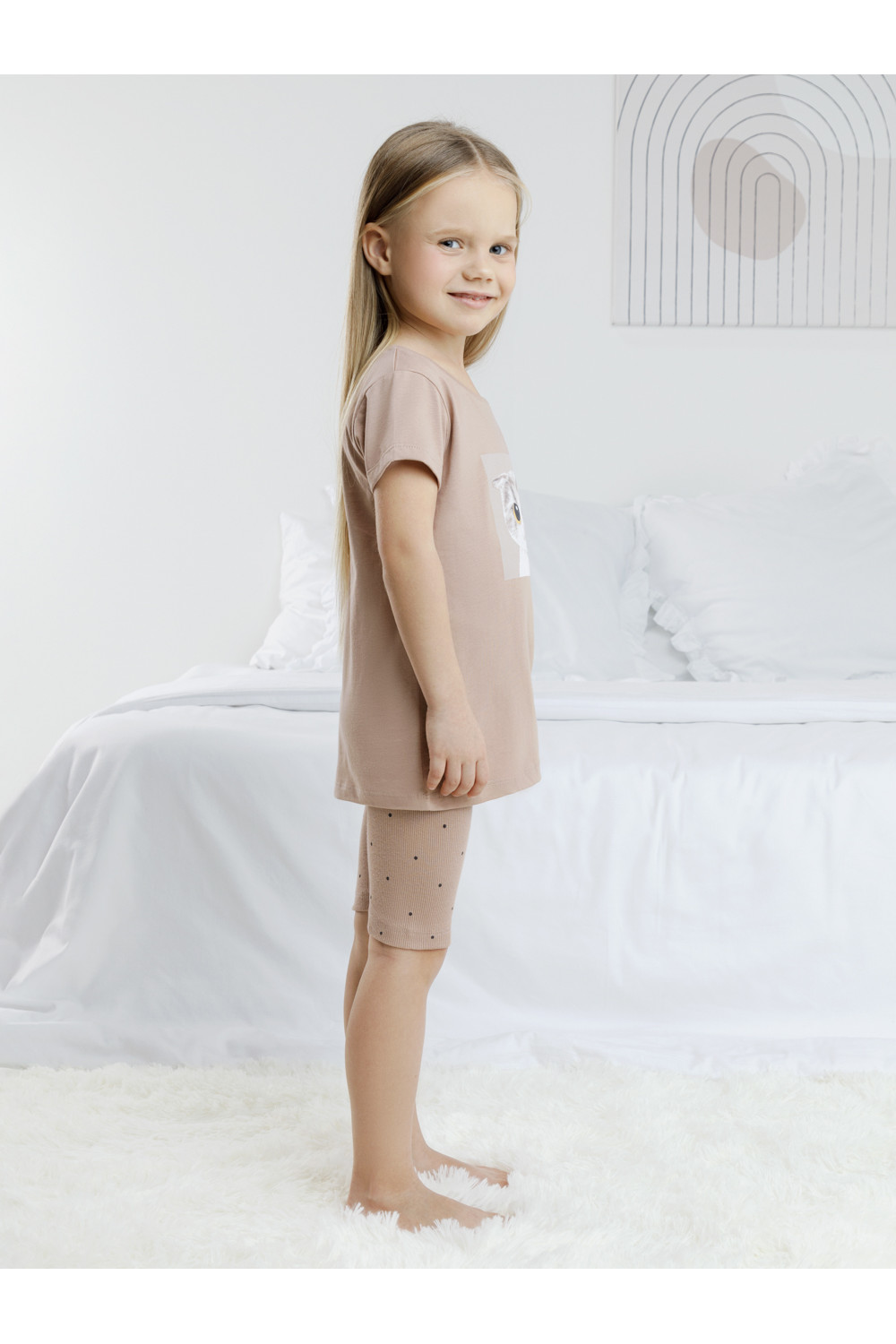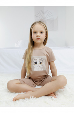 Трикотажная пижама для девочки с футболкой и велосипедками. Удлинённая футболка изготовлена из гладкого трикотажа супрем. Велосипедки выполнены из эластичного трикотажа в рубчик. Оригинальная набивка и принт выполнены из стойких текстильных гипоаллергенных красителей. Изделие сохраняет цвет и форму после многократных стирок. Все трикотажные полотна производятся в соответсвии с нормами швейцарского сертификата ЭкоТекс.