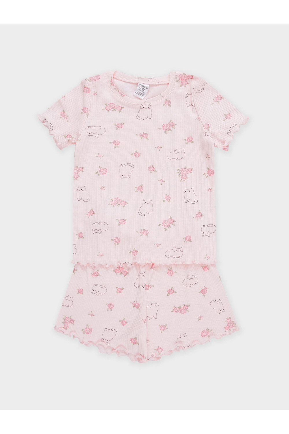 Трикотажная пижама в рубчик из натурального хлопка. Футболка с короткими втачными рукавами и шорты с эластичной резинкой в поясе. Оригинальная набивка выполнена из стойких текстильных гипоаллергенных красителей. Изделие сохраняет цвет и форму после многократных стирок. Все трикотажные полотна производятся в соответсвии с нормами швейцарского сертификата ЭкоТекс.