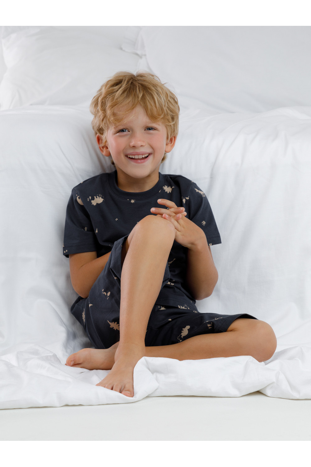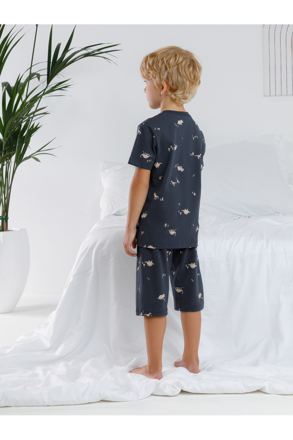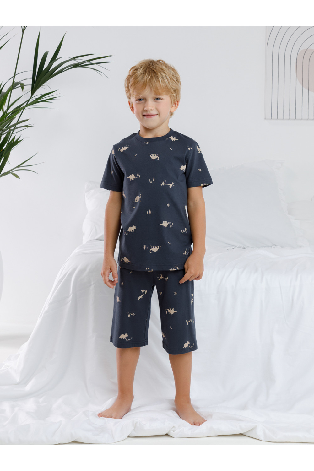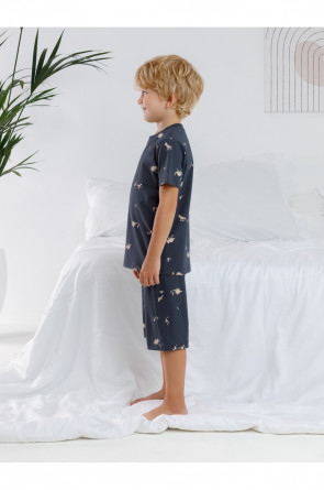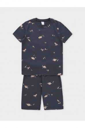 Пижама для мальчика из натурального хлопка. Футболка с короткими втачными рукавами и шорты с эластичной резинкой в поясе. Оригинальная набивка выполнена из стойких текстильных гипоаллергенных красителей. Изделие сохраняет цвет и форму после многократных стирок. Все трикотажные полотна производятся в соответствии с нормами швейцарского сертификата ЭкоТекс.