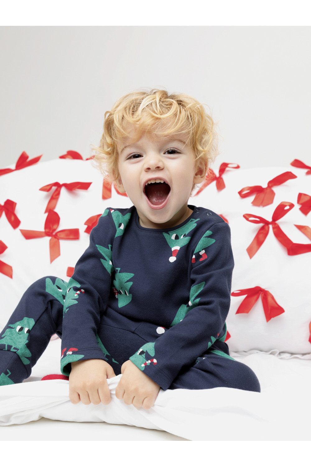 Трикотажная пижама из натурального хлопка. Джемпер с длинными втачными рукавами и брюки с эластичной резинкой в поясе. Отлично подойдёт для создания праздничных образов или в качестве подарка малышу на Новый год и Рождество. Джемпер застёгивается на кнопки. По низу брюк мягкие манжеты. Оригинальная набивка выполнена из стойких текстильных гипоаллергенных красителей. Изделие сохраняет цвет и форму после многократных стирок. Все трикотажные полотна производятся в соответствии с нормами швейцарского сертификата ЭкоТекс.