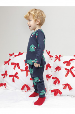 Трикотажная пижама из натурального хлопка. Джемпер с длинными втачными рукавами и брюки с эластичной резинкой в поясе. Отлично подойдёт для создания праздничных образов или в качестве подарка малышу на Новый год и Рождество. Джемпер застёгивается на кнопки. По низу брюк мягкие манжеты. Оригинальная набивка выполнена из стойких текстильных гипоаллергенных красителей. Изделие сохраняет цвет и форму после многократных стирок. Все трикотажные полотна производятся в соответствии с нормами швейцарского сертификата ЭкоТекс.