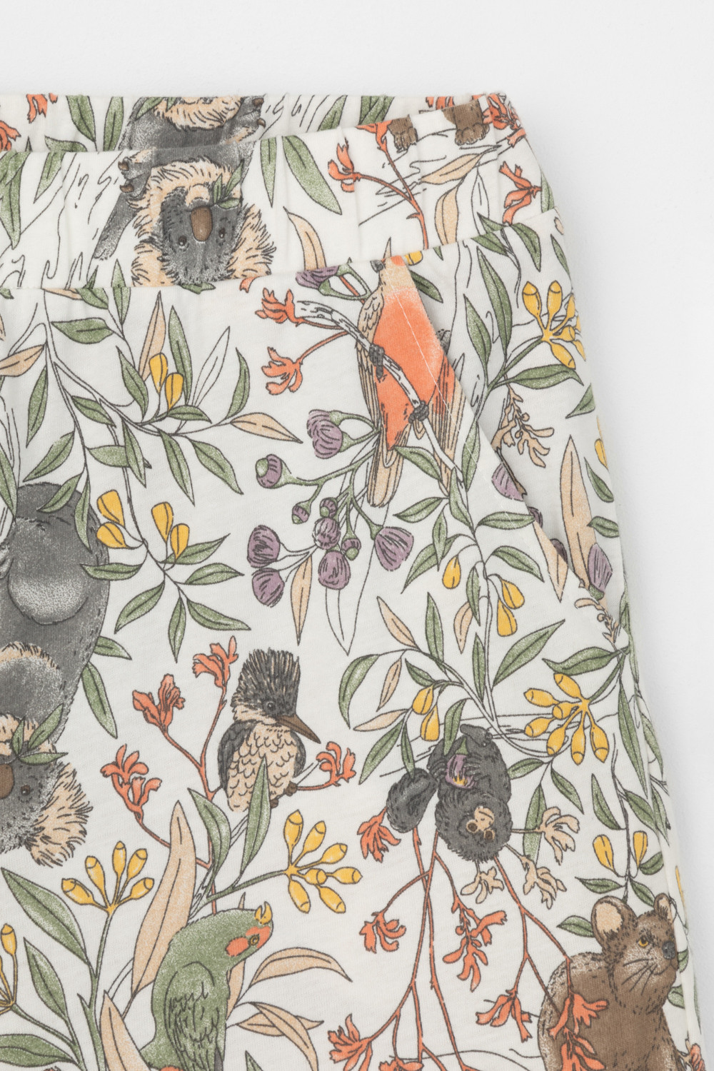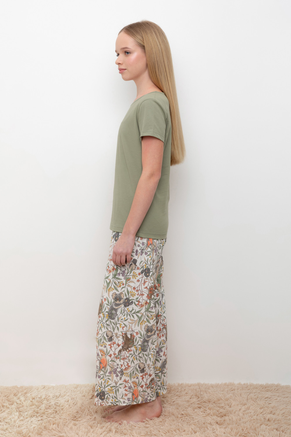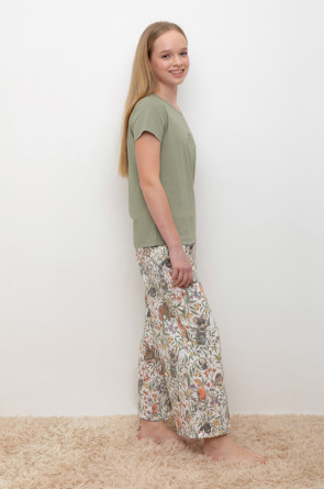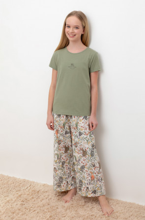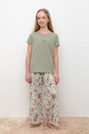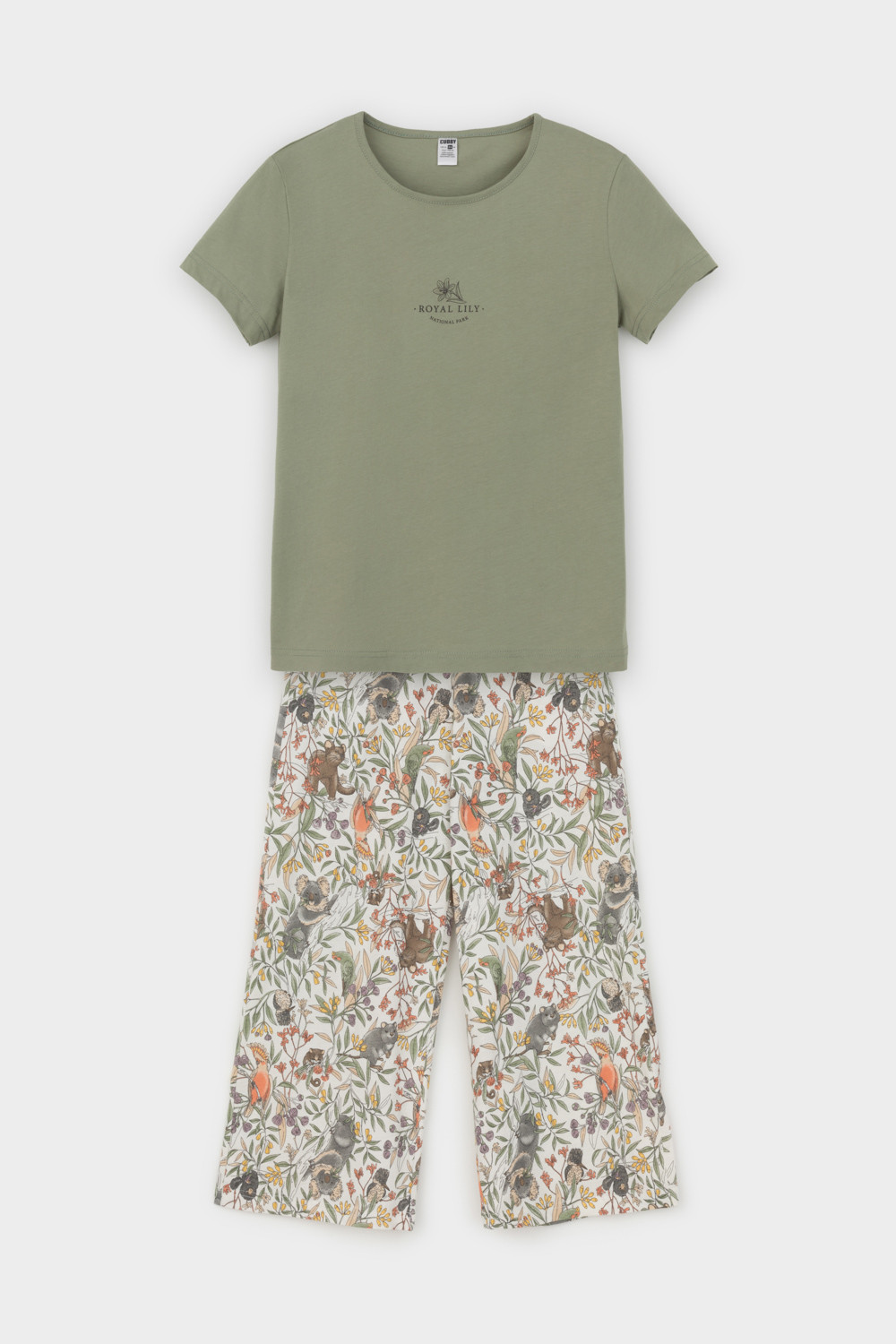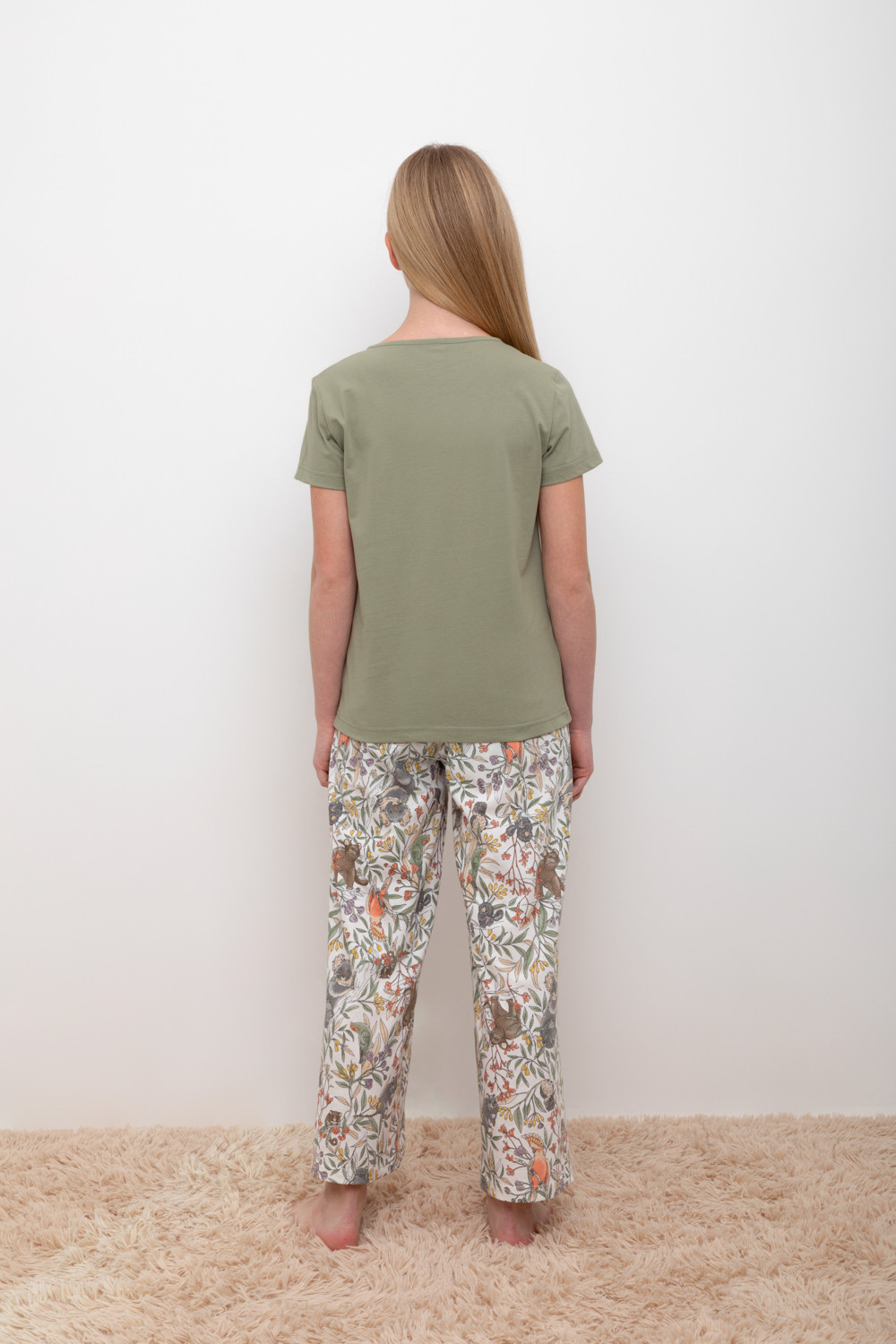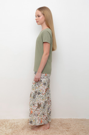 Трикотажный пижамный комплект из натурального хлопка. В комплекте футболка с короткими рукавами и со спущенными плечами. Укороченные брюки с удобным поясом на резинке. Оригинальная набивка и принт выполнены из стойких, гипоаллергенных текстильных красителей. Все трикотажные полотна производятся в соответствии с нормами Швейцарского сертификата ЭкоТекс.
