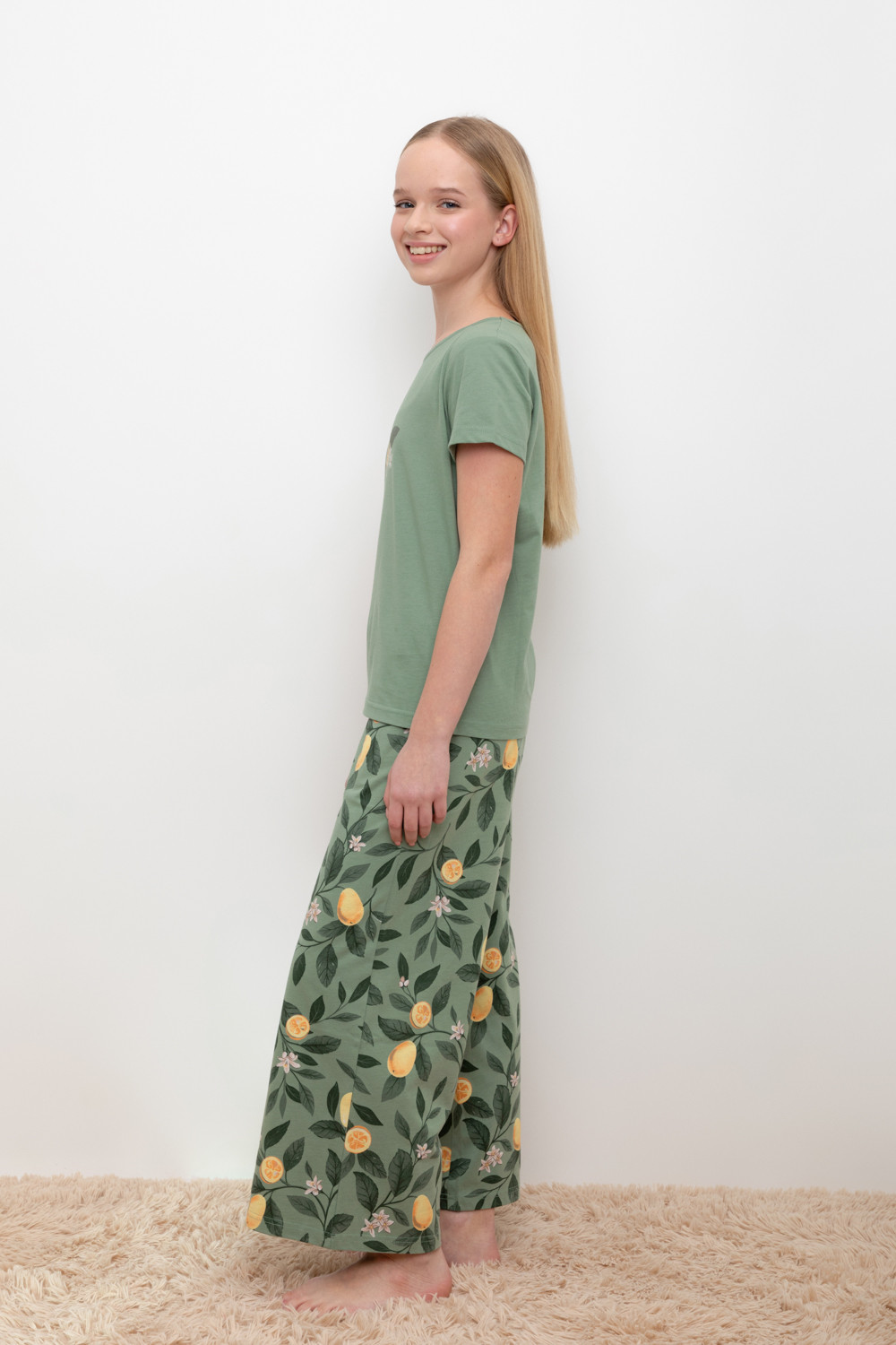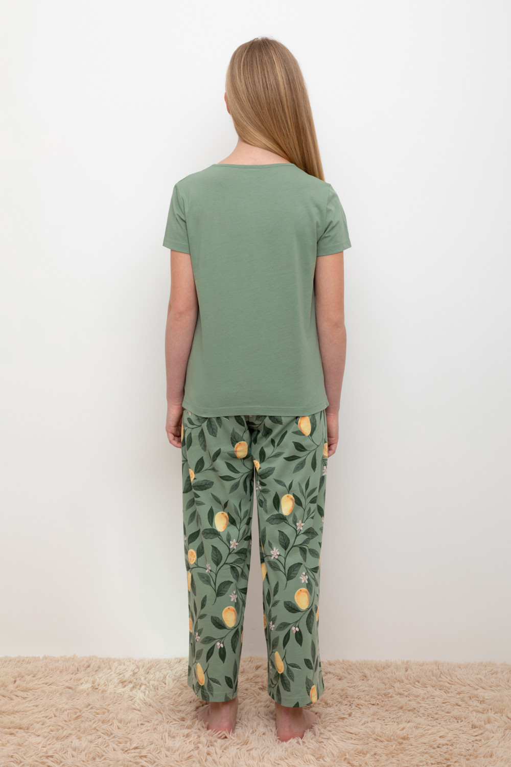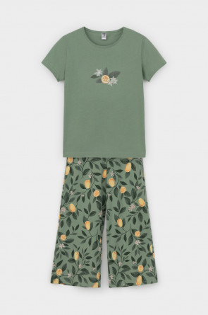 Трикотажный пижамный комплект из натурального хлопка. В комплекте футболка с короткими рукавами и со спущенными плечами. Укороченные брюки с удобным поясом на резинке. Оригинальная набивка и принт выполнены из стойких, гипоаллергенных текстильных красителей. Все трикотажные полотна производятся в соответствии с нормами Швейцарского сертификата ЭкоТекс.