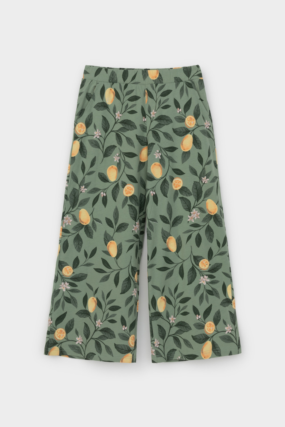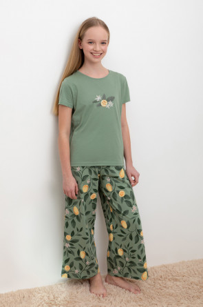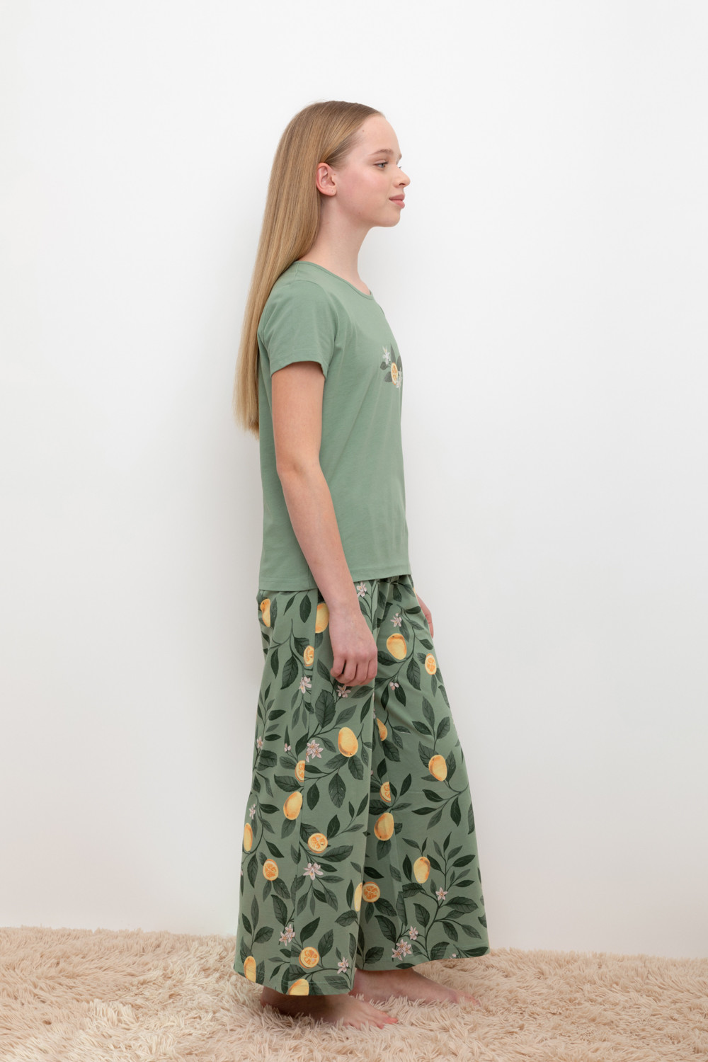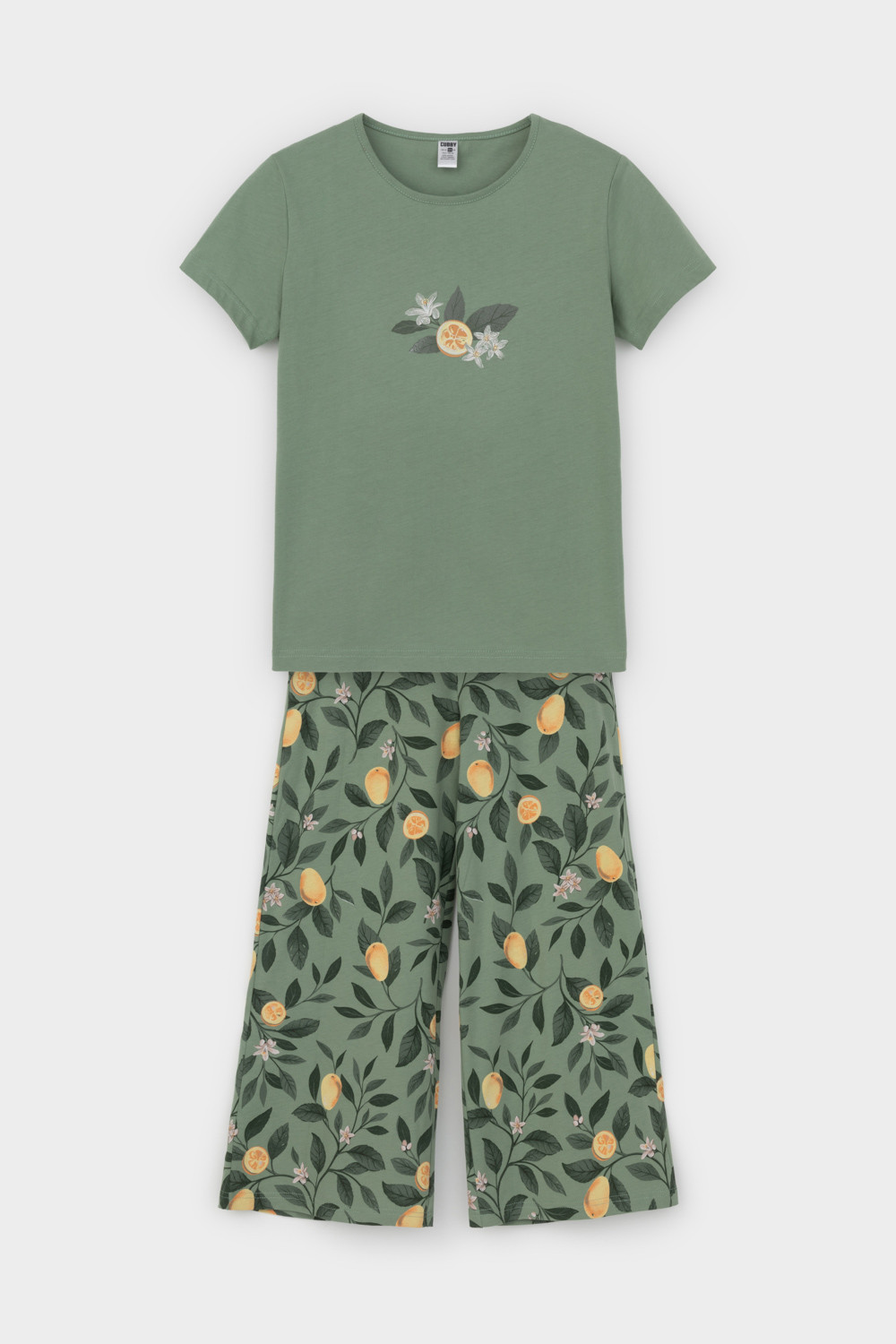 Трикотажный пижамный комплект из натурального хлопка. В комплекте футболка с короткими рукавами и со спущенными плечами. Укороченные брюки с удобным поясом на резинке. Оригинальная набивка и принт выполнены из стойких, гипоаллергенных текстильных красителей. Все трикотажные полотна производятся в соответствии с нормами Швейцарского сертификата ЭкоТекс.