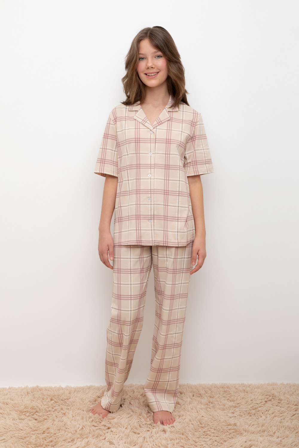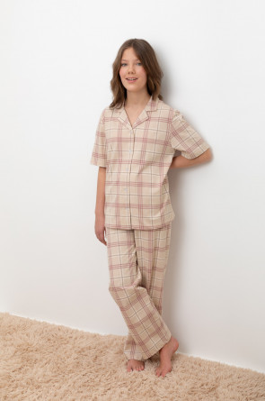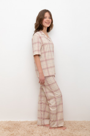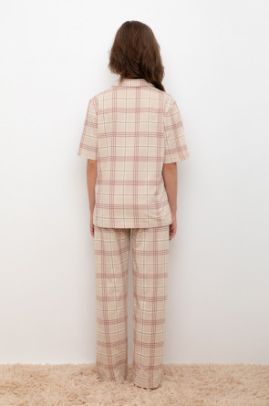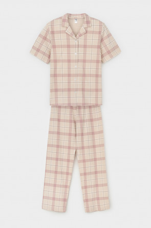 Трикотажный пижамный комплект из натурального хлопка. В комплекте рубашка с короткими рукавами и застежкой на пуговицы. Прямые брюки с удобным поясом на резинке. Оригинальная набивка выполнена из стойких, гипоаллергенных текстильных красителей. Все трикотажные полотна производятся в соответствии с нормами Швейцарского сертификата ЭкоТекс.