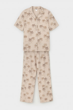 Трикотажный пижамный комплект из натурального хлопка. В комплекте рубашка с короткими рукавами и застежкой на пуговицы. Прямые брюки с удобным поясом на резинке. Оригинальная набивка выполнена из стойких, гипоаллергенных текстильных красителей. Все трикотажные полотна производятся в соответствии с нормами Швейцарского сертификата ЭкоТекс.