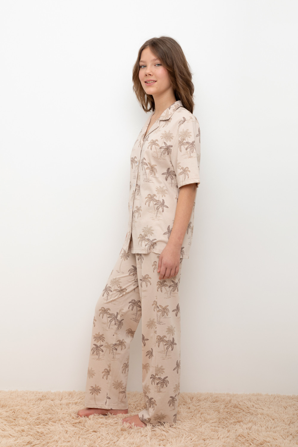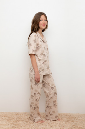Трикотажный пижамный комплект из натурального хлопка. В комплекте рубашка с короткими рукавами и застежкой на пуговицы. Прямые брюки с удобным поясом на резинке. Оригинальная набивка выполнена из стойких, гипоаллергенных текстильных красителей. Все трикотажные полотна производятся в соответствии с нормами Швейцарского сертификата ЭкоТекс.