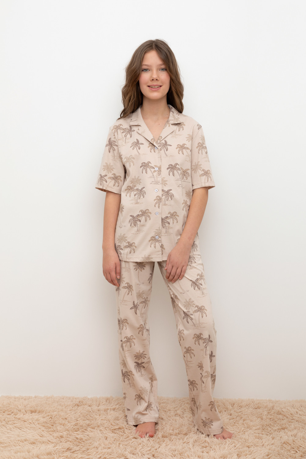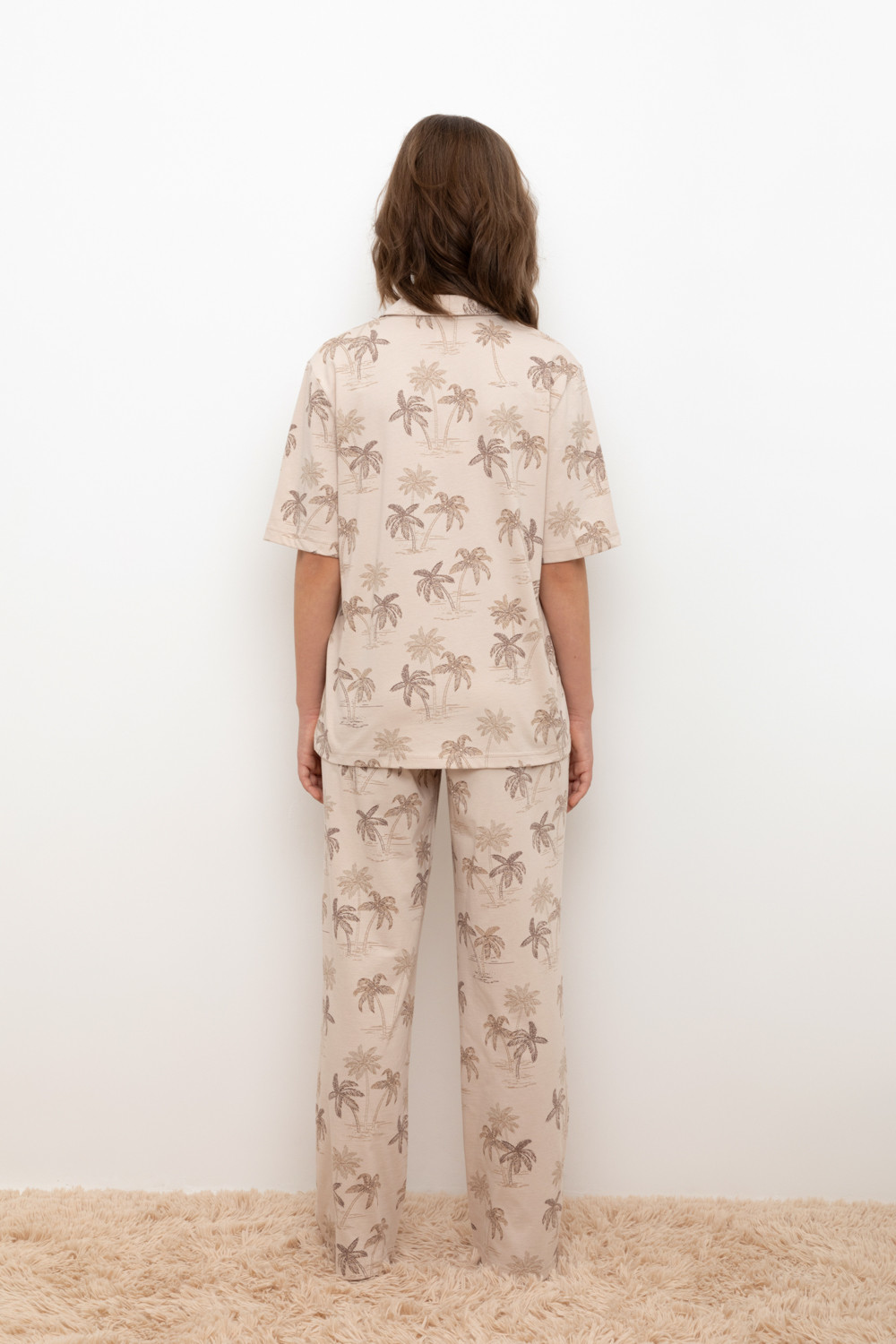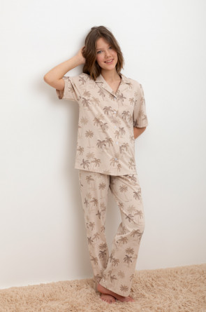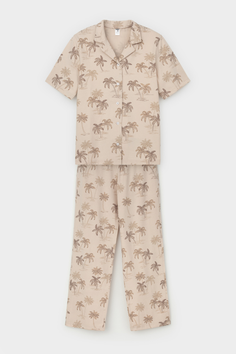 Трикотажный пижамный комплект из натурального хлопка. В комплекте рубашка с короткими рукавами и застежкой на пуговицы. Прямые брюки с удобным поясом на резинке. Оригинальная набивка выполнена из стойких, гипоаллергенных текстильных красителей. Все трикотажные полотна производятся в соответствии с нормами Швейцарского сертификата ЭкоТекс.